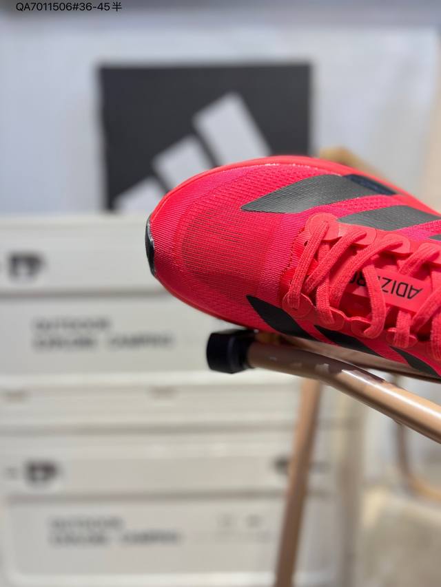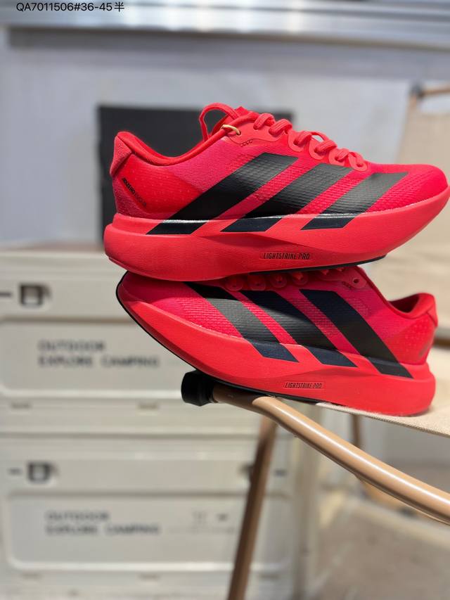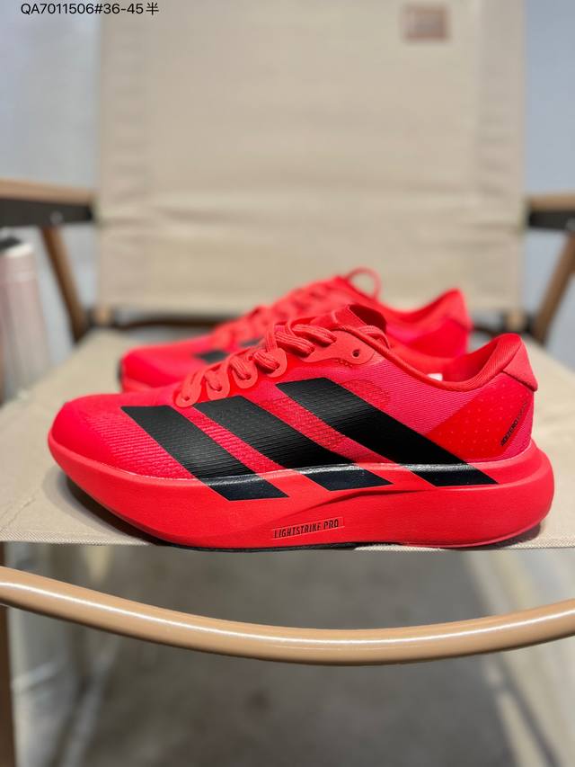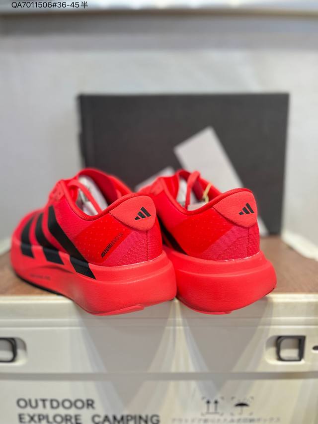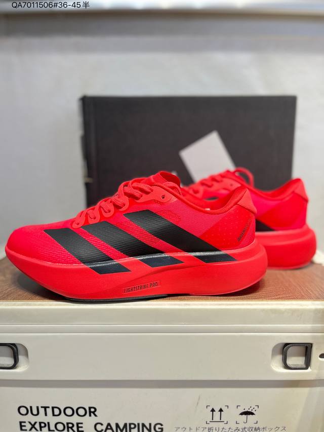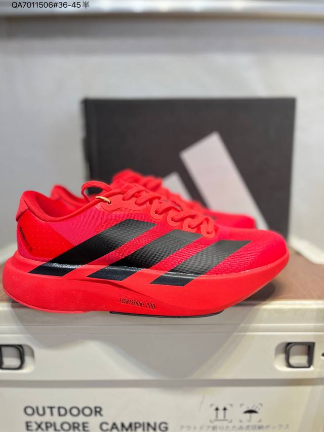 Adidas Adizero Evo Sl M 马拉松竞速专业跑鞋 Celermesh针织网面非常轻薄 纤维间的缝隙很大 可以保证跑步时的透气、排汗效果 鞋舌直接与两侧的内衬和鞋底连接在一起 在跑步过程中不会被鞋舌的左右移动所困扰 在标准鞋带孔的基础上再拓宽一组鞋带孔 适合不同脚型的需求 突破性 Energyrods 技术,有助于跑者实现更好的成绩 中底独特的Lightstrike Pro泡棉材质 微弹感觉在跑步过程中给予了良好的支撑体验 对于顶级精英和高水平进阶跑者来说 Adios Pro是一双值得信赖