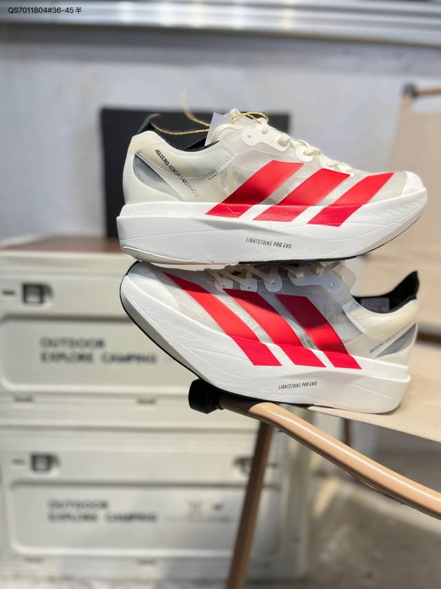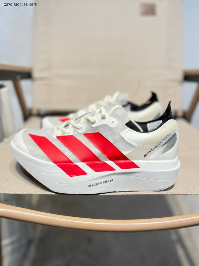 FFF Adidas Adizero Pro Evo 2阿迪超轻透气缓震跑鞋 DDD 整体外观造型与Adizero Adios Pro Evo 1非常相似 中底配置方面搭载全掌Lightstrike Pro DDD 鞋面采用透气网面示人 契合日常训练鞋的定位 更加耐用 DDD 外底给到了马牌橡胶 及上代竞速旗舰Adidas Adizero Adios Pro 3区域分布Ih5579 Qs7011804#36-45半 DDD