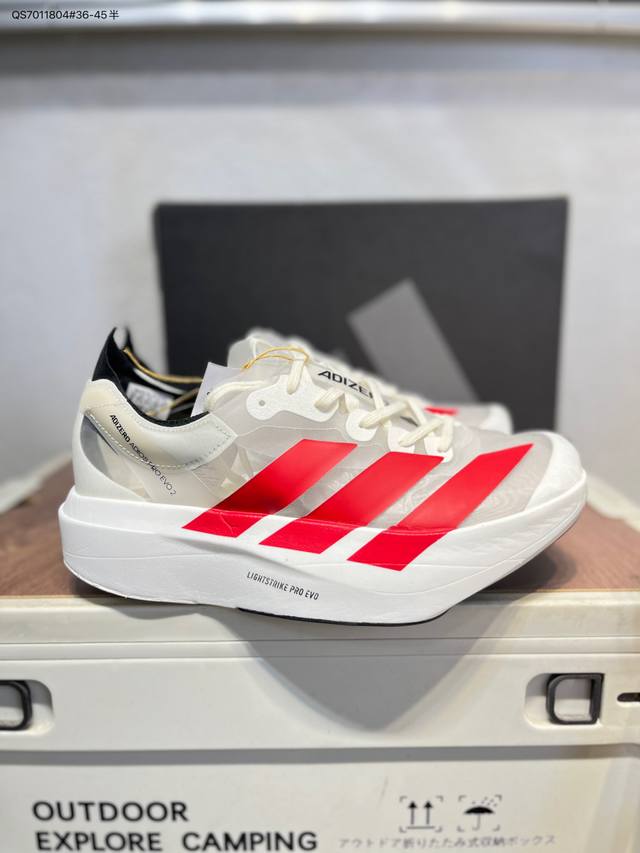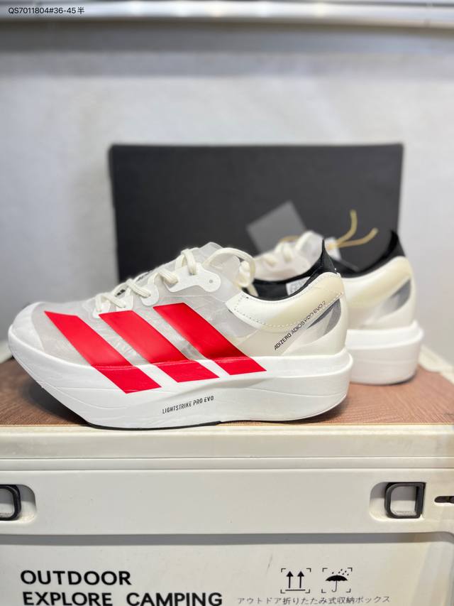 Adidas Adizero Pro Evo 2阿迪超轻透气缓震跑鞋 DDD 整体外观造型与Adizero Adios Pro Evo 1非常相似 中底配置方面