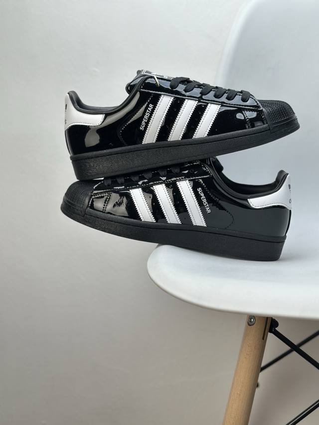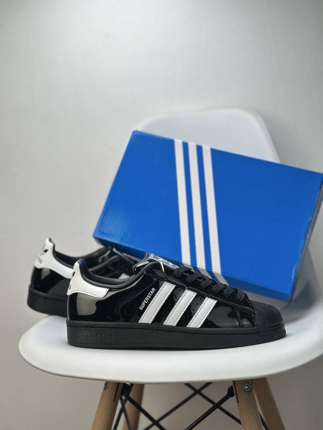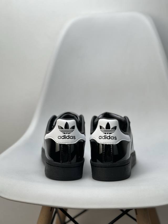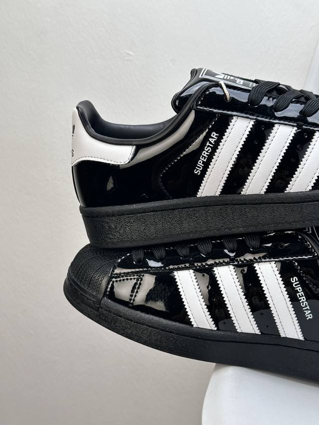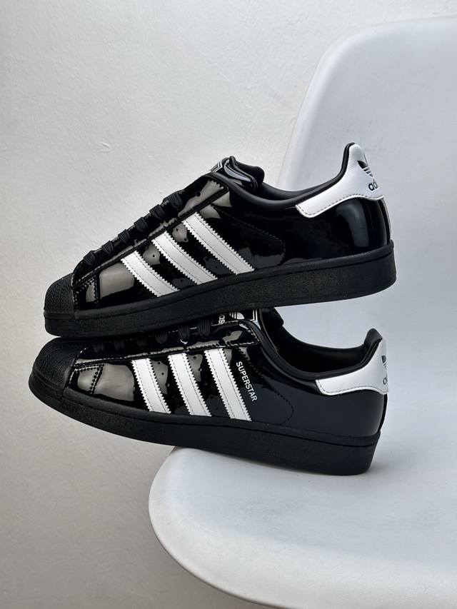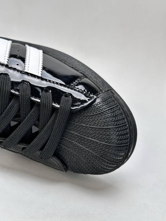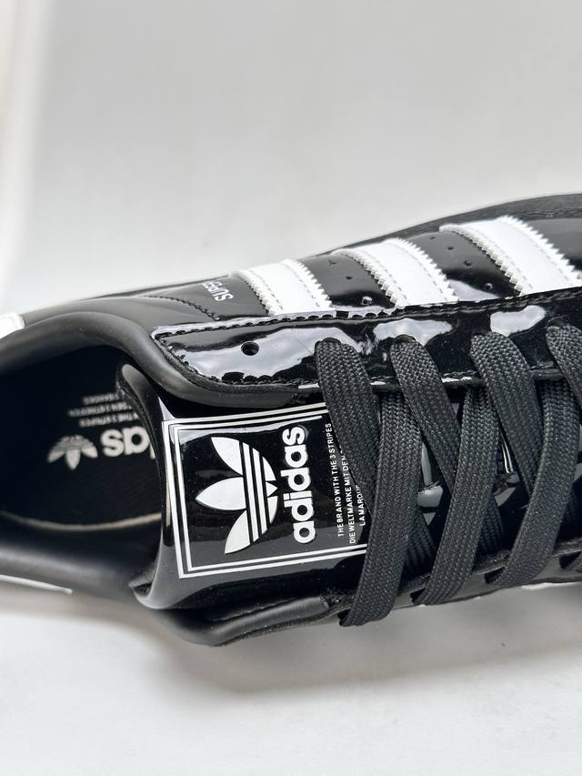采用漆皮牛剖革鞋面材质# 改良全包围鞋垫#正确 版鞋底模具及扇贝头盖片阿迪达斯 三叶草Adidas Originals Superstar Ii J Black 经典贝壳头古着系列低帮百搭休闲运动板鞋Y“漆皮黑白”Jh7756