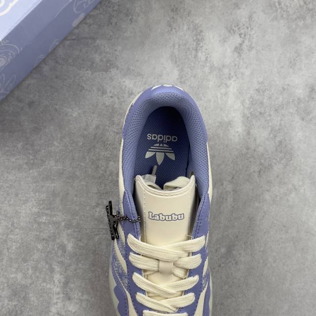 鞋身整体采用米白色帆布打造,搭配经典T字形紫色框架覆盖层,鞋身两侧经典锯齿三条杠Logo采用紫色点缀,侧身Labubu字样紫色妆点,鞋舌上以Labubu字样呈现,瞬间提升鞋子的时尚程度,后跟装饰片辅以紫色制作并带有三叶草Llogo,后跟印有拉布布头像,彰显联名身份,最后以乳白色半透明中底搭配同色橡胶外底完善整体设计收尾。