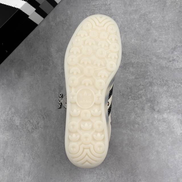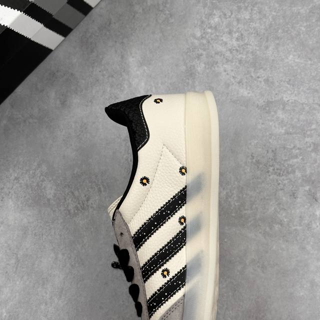 鞋身整体采用米白色皮革打造 搭配经典T字形灰色麂皮框架覆盖层 鞋身两侧经典锯齿三条杠Logo采用黑色点缀 侧身点缀金色Gazelle字样 鞋舌上以小雏菊Logo及Adidas字样呈现 瞬间提升鞋子的时尚程度 后跟装饰片辅以黑色制作并带有三叶草Llogo 后跟印有小雏菊Logo 彰显联名身份 最后以乳白色半透明中底搭配同色橡胶外底完善整体设计收尾