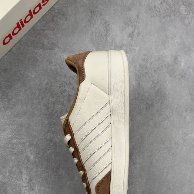 鞋身整体采用米白色皮革打造 搭配经典T字形棕色麂皮框架覆盖层 鞋身两侧经典锯齿三条杠Logo采用白色点缀 侧身点缀金色Supreme字样 鞋舌上以白色Adidas字样及三叶草Logo呈现 瞬间提升鞋子的时尚程度 后跟装饰片辅以棕色制作并带有白色Adidas字样及三叶草Logo 后跟印有Supremeq字样 彰显联名身份 最后以米白色中底搭配同色橡胶外底完善整体设计收尾
