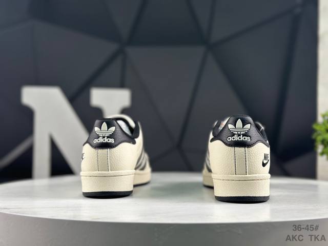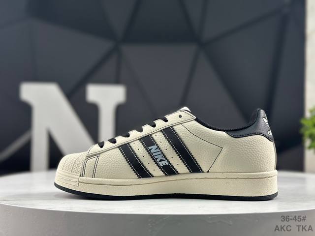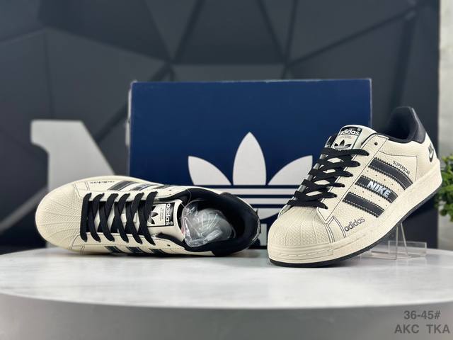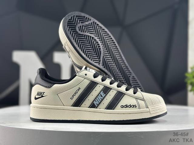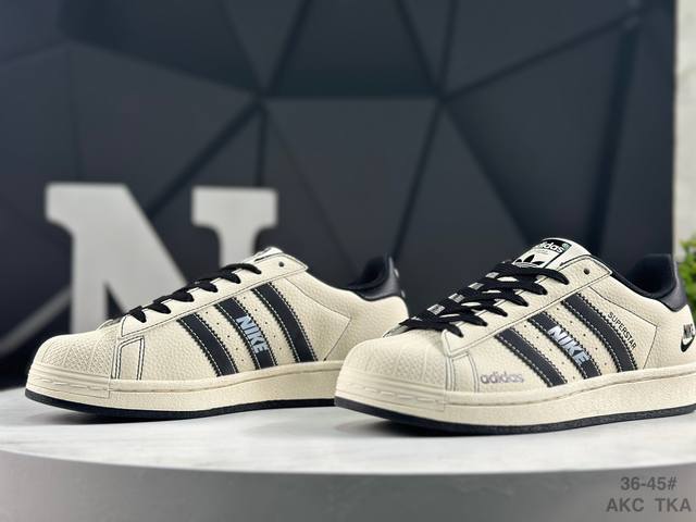 海外爆款限量发售!高端定制 阿迪达斯 Adidas Superstar “Nike联名- 白灰”延续 Adidas 标志性贝壳头,复古腔调拉满,奶白主色调 + 深灰三道杠 + 黑色细节点缀,保留复古休闲基底,大胆融入 Nike Swoosh Logo + 品牌字体,两大巨头元素碰撞,酷飒感直接拉满!鞋侧还挂着 “Superstar” 金属环 + 三叶草吊坠, 高端定制 低帮休闲板鞋 定制鞋盒 大厂纯原品质出货 超高清洁度 皮料切割干净无任何毛边 细节完美 货号:Ds5807 Size:36 36.5 37