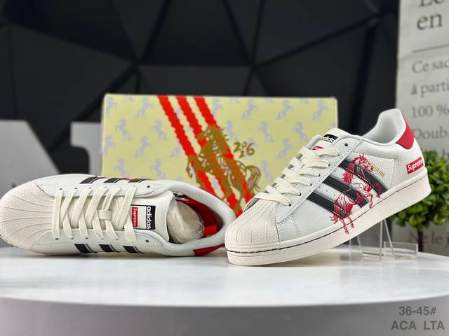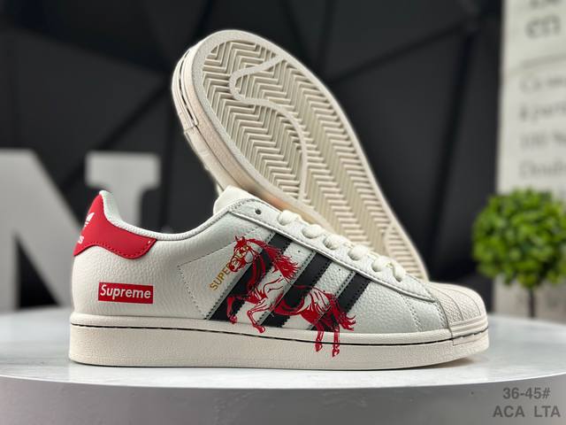 2026年新款限量发售 阿迪达斯 Ad Superstar 定制配色 三叶草低帮休闲百搭贝壳头板鞋 “Supreme联名-马年限定” Ddd 公司级版本 大厂流水作业生产 超高清洁度 皮料切割干净无任何毛边 细节完美 Ddd 货号:Jx8905 Ddd 尺码:36 36.5 37 38 38.5 39 40 40.5 41 42 42.5 43 44 44.5 45 Aca Lta DDD