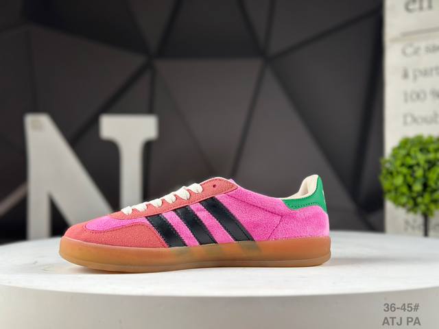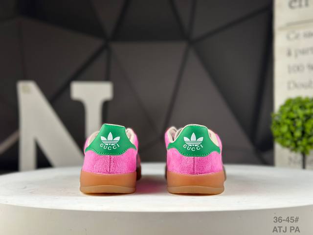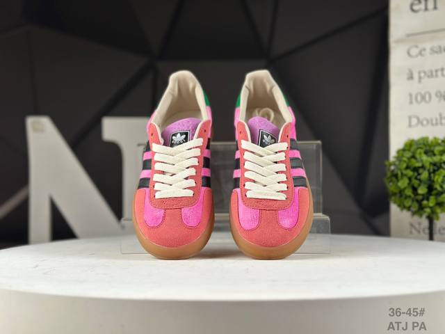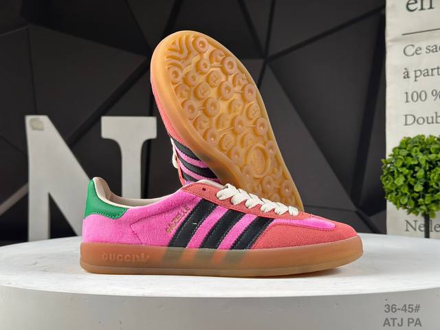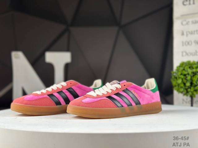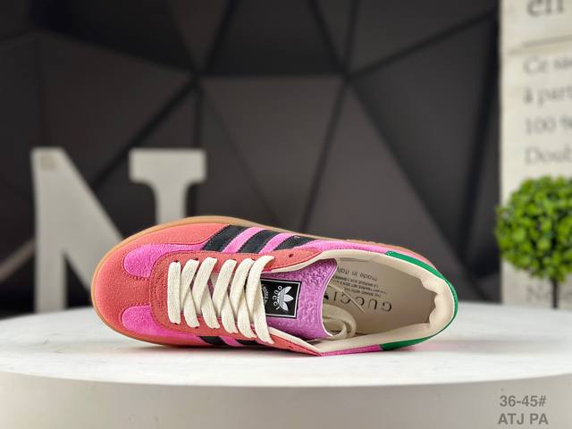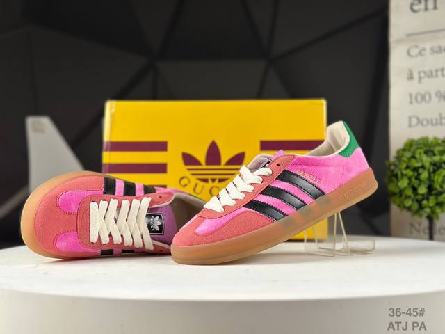 Adidas X Gucci 重磅联名 三叶草Logo与标志性三条杆为设计元素 将其与独属于的Gucci 双方选择Adidas Originals经典鞋型 Gazalle为蓝本,生胶鞋底搭载三叶草和Gucci Logo,蟒蛇纹、绒面、麂皮等材质纹理覆盖在鞋面上,将奢华复古与运动风相结合却不显违和感。三条杆的德训鞋今年也是要继续走俏