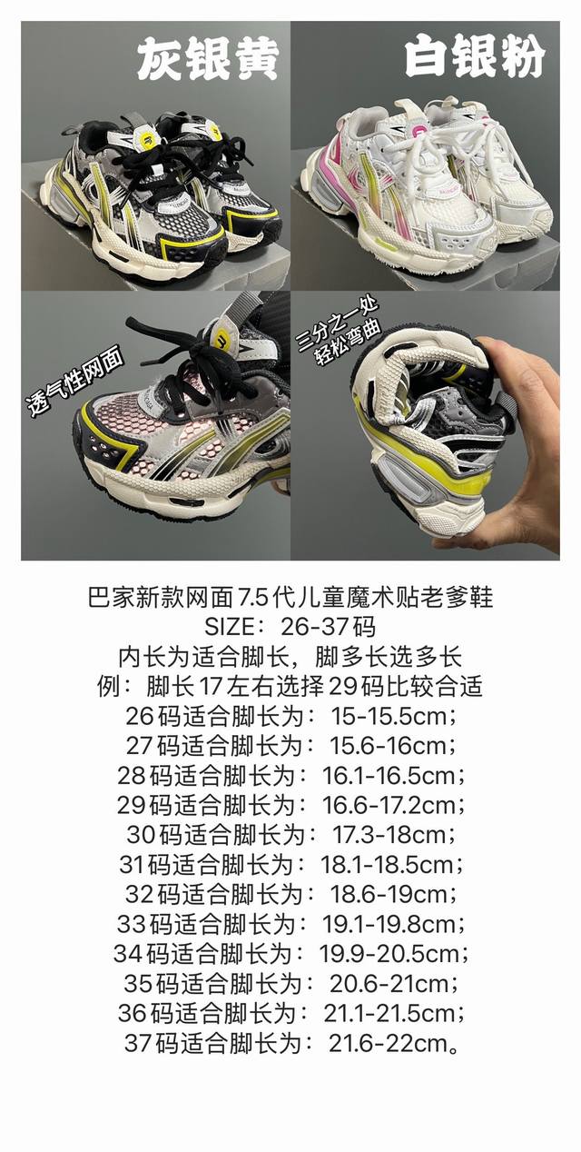 / 巴家新款网面7.5代儿童魔术贴老爹鞋 Size:26-37码 经典巴黎世家7.5老爹款式 网面设计,透气又舒适 魔术贴设计,穿脱超方便 耐磨防滑大底,脚感不言而