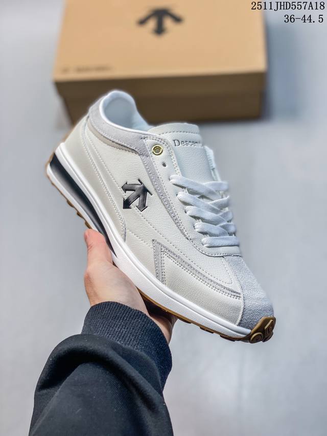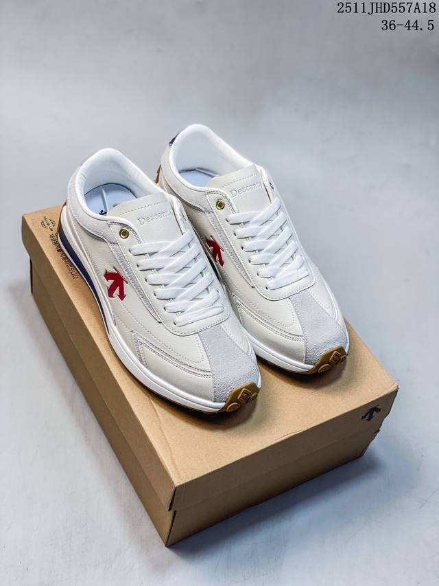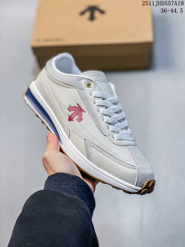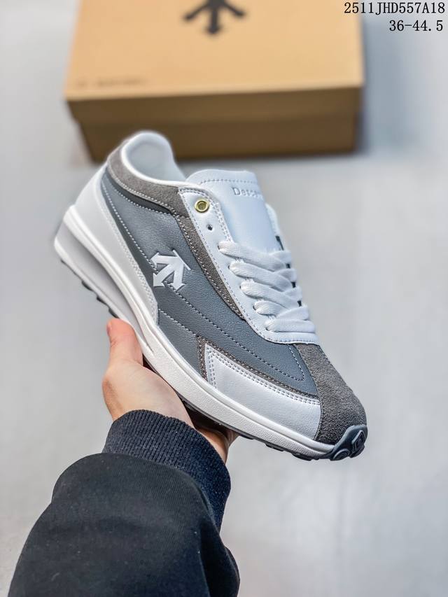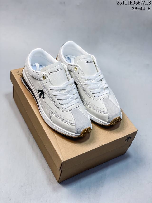 新品公司级 Descente Cron Racer 迪桑特休闲板鞋,男女款设计,迪桑特Cron Racer系列是一款融合日系极简设计与功能科技的多场景休闲鞋,核心特点如下:1. 核心功能与技术,全天候防滑大底:适配都市通勤、雨天出行等场景。Eva缓震层+Tpu抗扭片:降低骑行、露营等轻运动后的足部疲劳感。易打理材质:牛皮革与麂皮拼接鞋面 好打理皮面 +抗污设计+抗菌鞋垫,适合学生、宝妈等高频使用人群,2. 设计风格与穿搭。日系复古跑鞋风:哑光皮革与翻毛皮材质,突出City Boy风格。适用场景:轻户外徒步