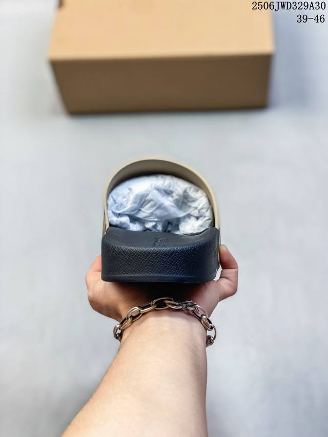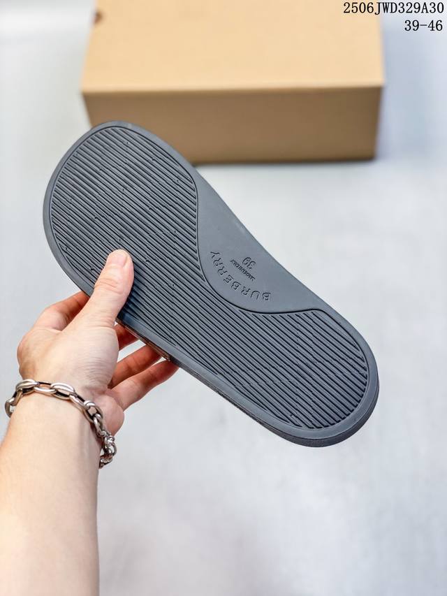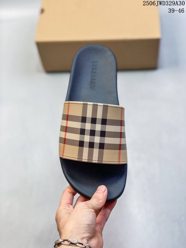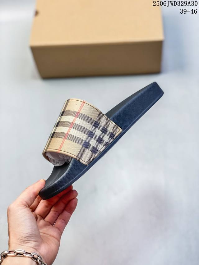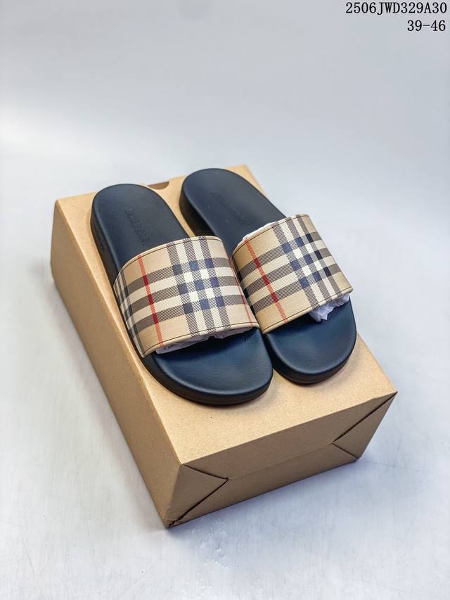 Burberry 巴宝莉 男女鞋,配置硬质天地盖礼盒及防尘袋说明书,采用Ip高密度防滑橡胶鞋底及3D立体Tpu光泽上盖材质英国传统风格 奢侈品牌 博柏利 巴宝莉Burberry Furley Check Pvc Slide Sandals夏季时尚潮流爆款时装周街拍潮流涉水凉拖鞋“黑卡其黄灰条纹格子印花 201376M234217
