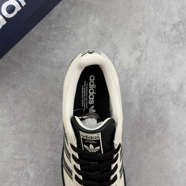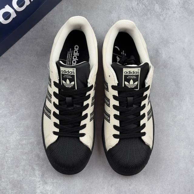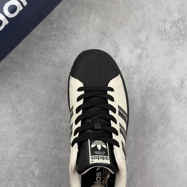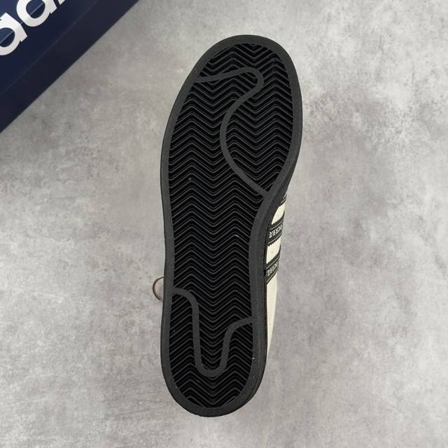 鞋身整体采用米白色皮革打造,搭配经典黑色贝壳头,鞋身两侧经典锯齿三条杠Logo采用黑色点缀,侧身Superstar辅以黑色压印妆点,鞋舌上以黑色Adidas字样及三叶草Logo呈现,瞬间提升鞋子的时尚程度,后跟装饰片辅以白色制作并带有黑色Adidas字样及三叶草Llogo,后跟印有克罗心品牌Logo字样,彰显联名身份,最后以黑色中底搭配同色