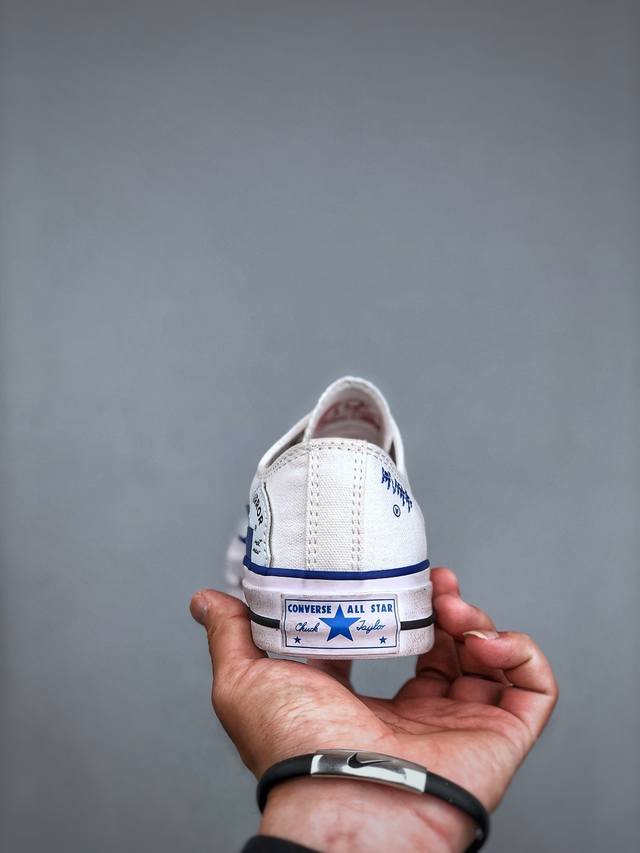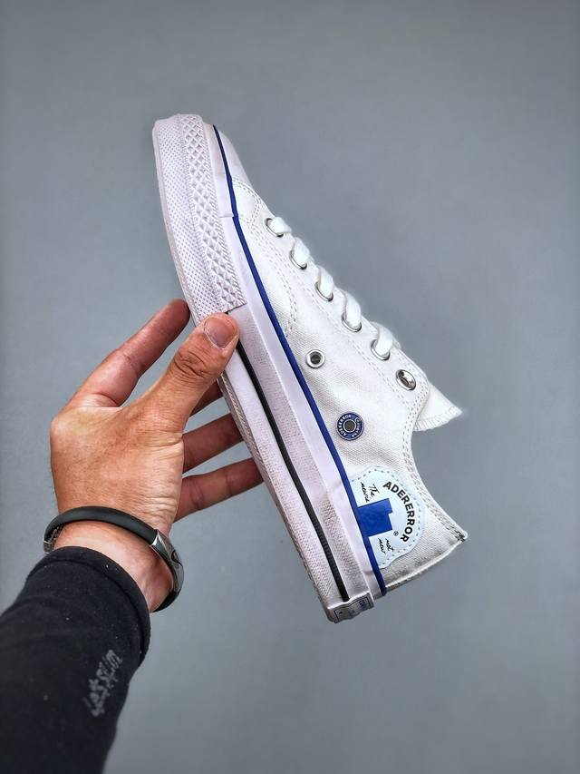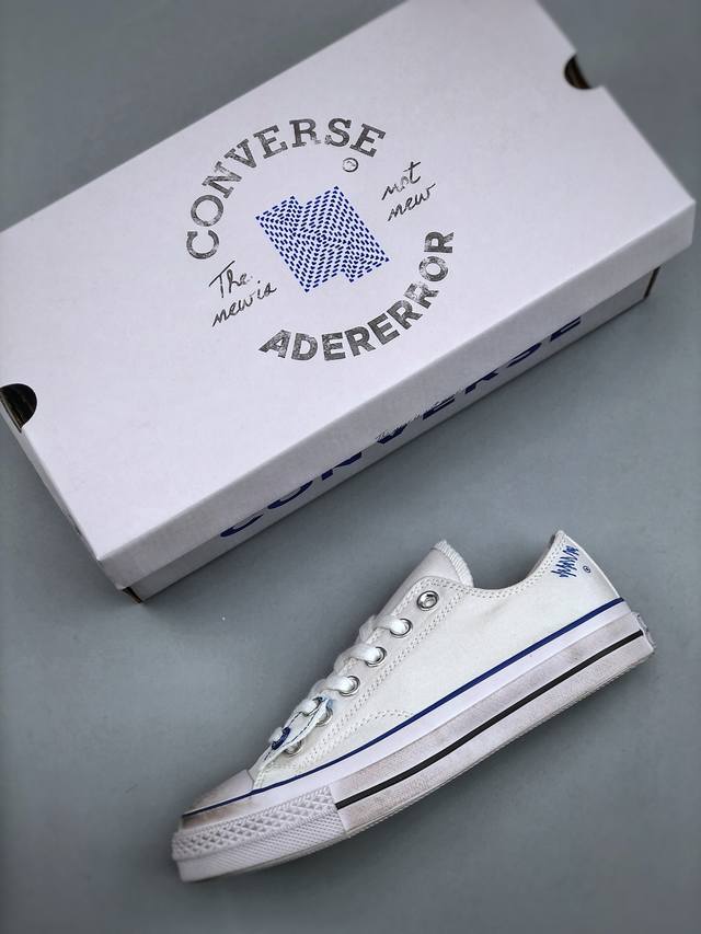 ader Error 与 Converse 的合作时隔两年多再度回归 此番以经典的 Chuck 70 Low 作为蓝本 前者以白色主体搭配蓝色包边条和后跟部位的刺绣 采用 Ader Error 标志性的皇家蓝色 白色围边运用了明显的做旧工艺 模仿长时间穿着的痕迹 提升视觉层次感