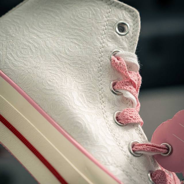立体心形粉红玫瑰挂牌,鞋面采用玫瑰花刺绣+提花纹理,暗藏浪漫摩斯密码~爱心红底步步生情,附赠粉红蕾丝鞋带系住桃花运!经典高帮版型配牛仔甜辣,搭纱裙仙气拉满,Ortholite鞋垫走路自带粉红泡泡~情人节专属仪式感,高甜出街锁定C位!#匡威情人节限定 #Chuck70玫瑰情书 #情人