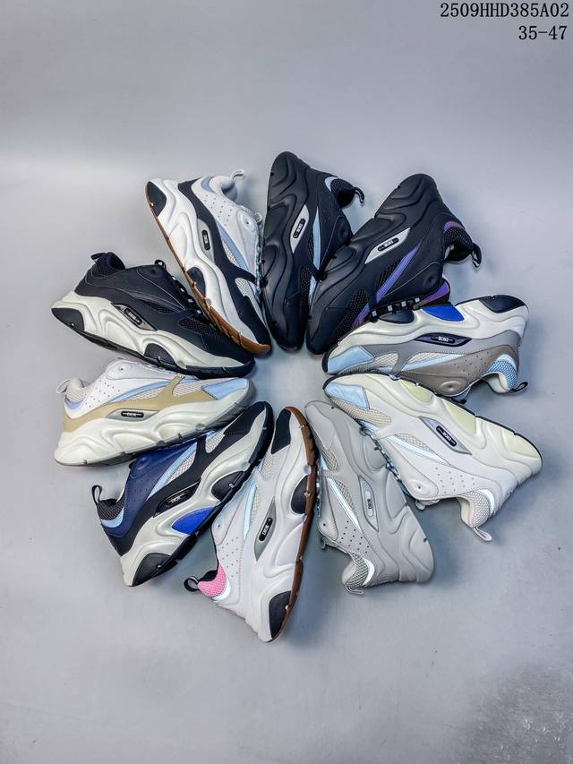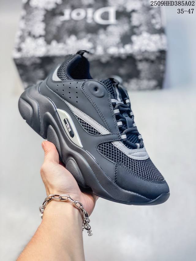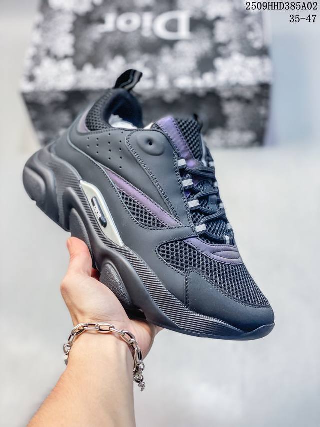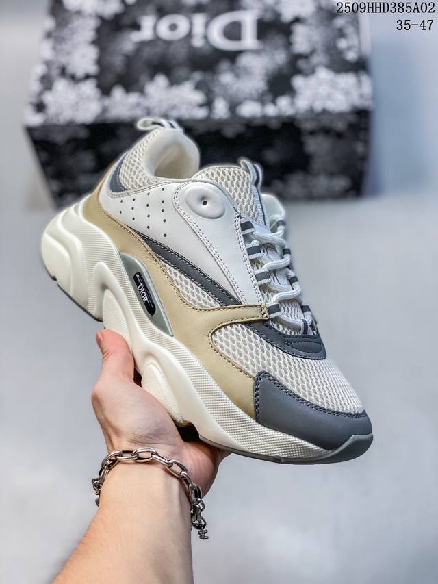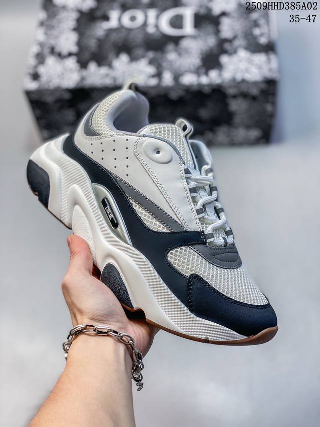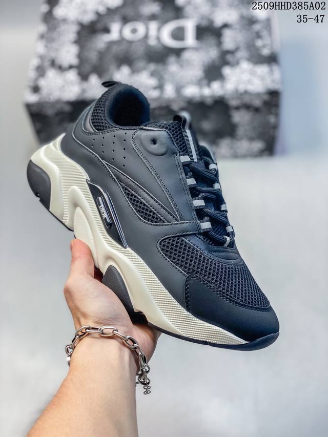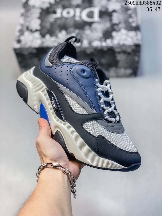 广东原产原楦原纸版数据开发 配置专柜购物袋及配件 配置抗压快递外包牛皮纸壳 采用光滑牛皮革组合网织布面材质 正确吸汗网布贴合海玻璃Cd压纹鞋垫独家开发Tpu弹力中底组合Tr光泽耐韧锯齿橡胶大底 法国高奢时装品牌-迪奥 桀傲 Dior Homme B22 Trainer Sneaker系列复古厚底老爹风休闲运动慢跑鞋“生胶底”