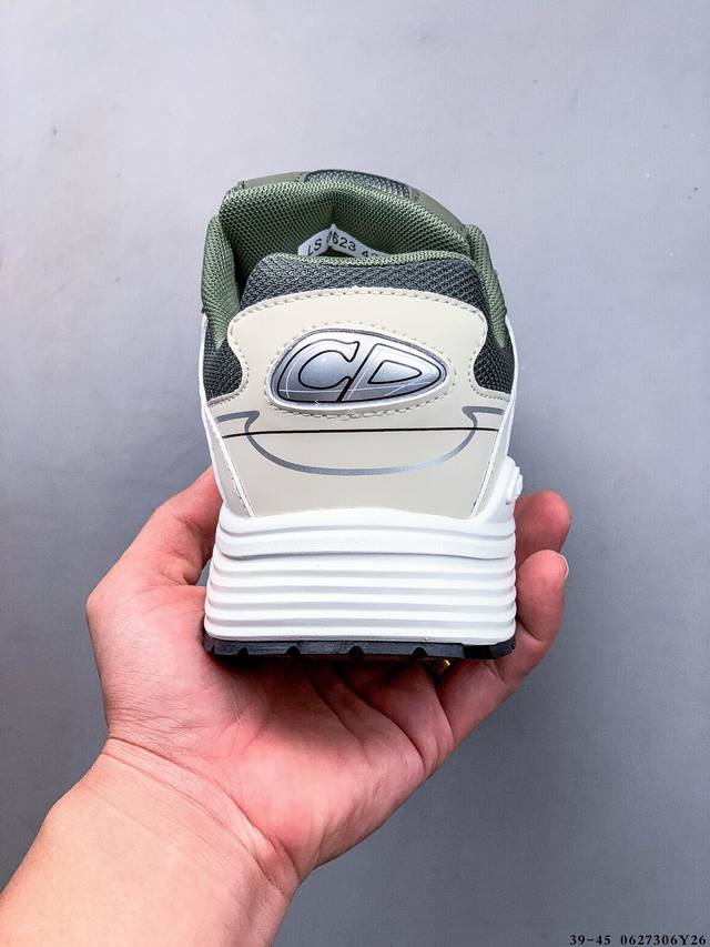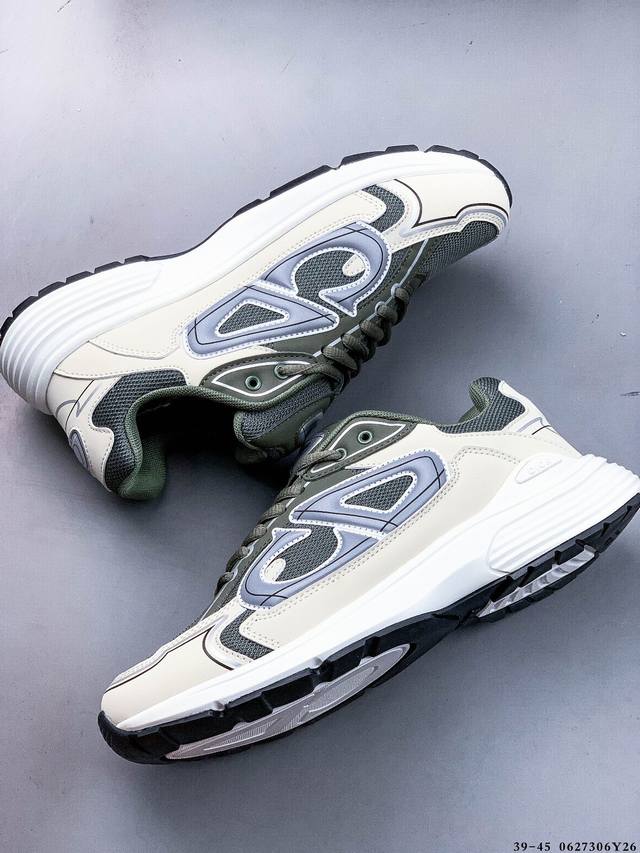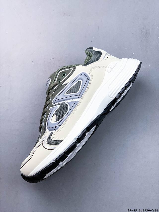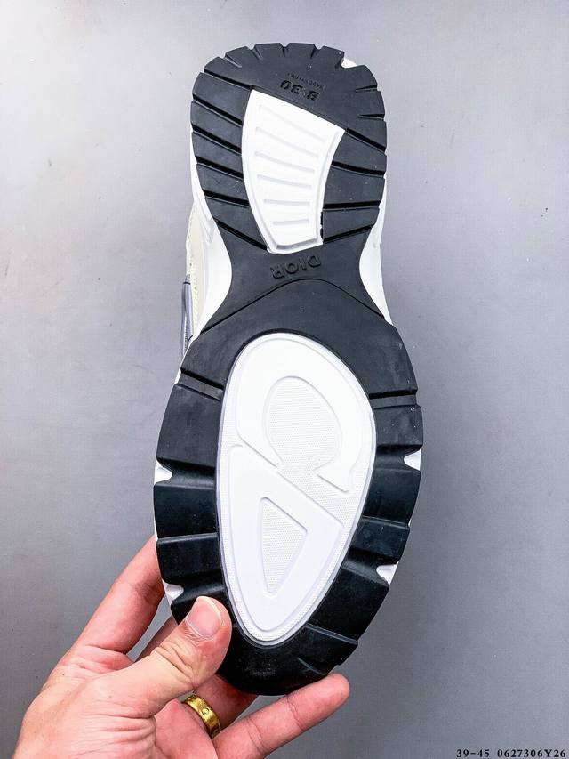 B30运用了质感细腻的皮革与网眼布面材质拼接成鞋身,鞋身两侧贴有显眼的字母Cd表明身份,为Christian Dior缩写。鞋身多处线条勾勒细节,让鞋子整体看起来不那么单调。搭载奶油色Eva、橡胶混合大底,复古风十足!