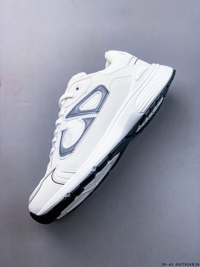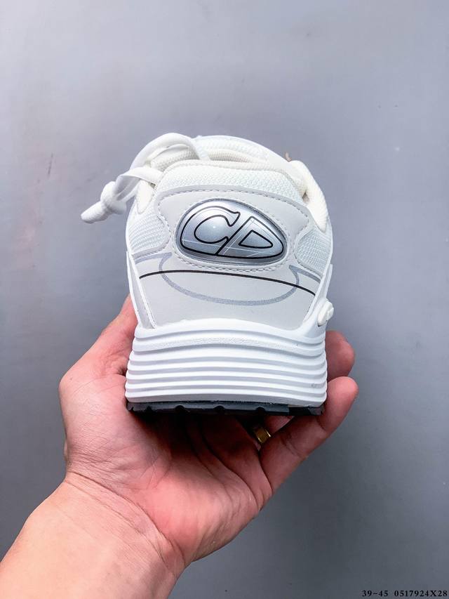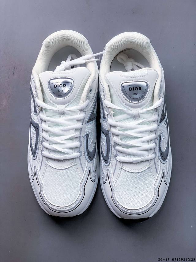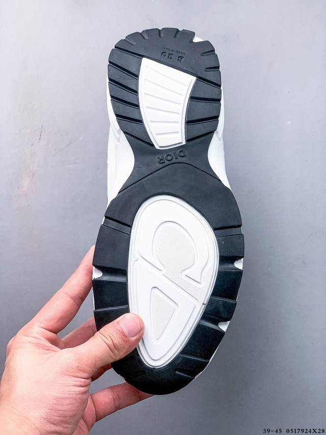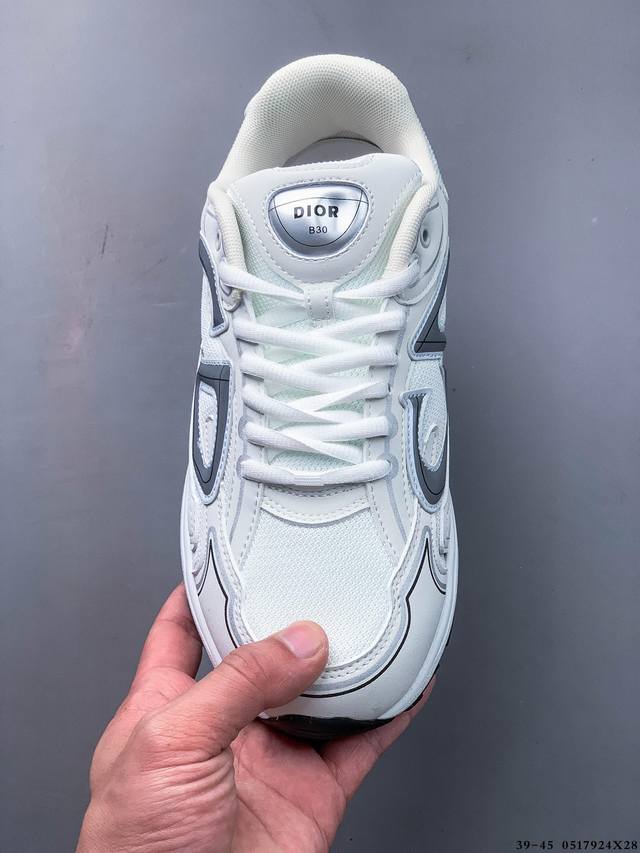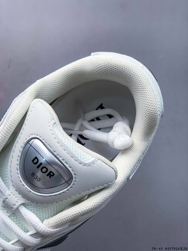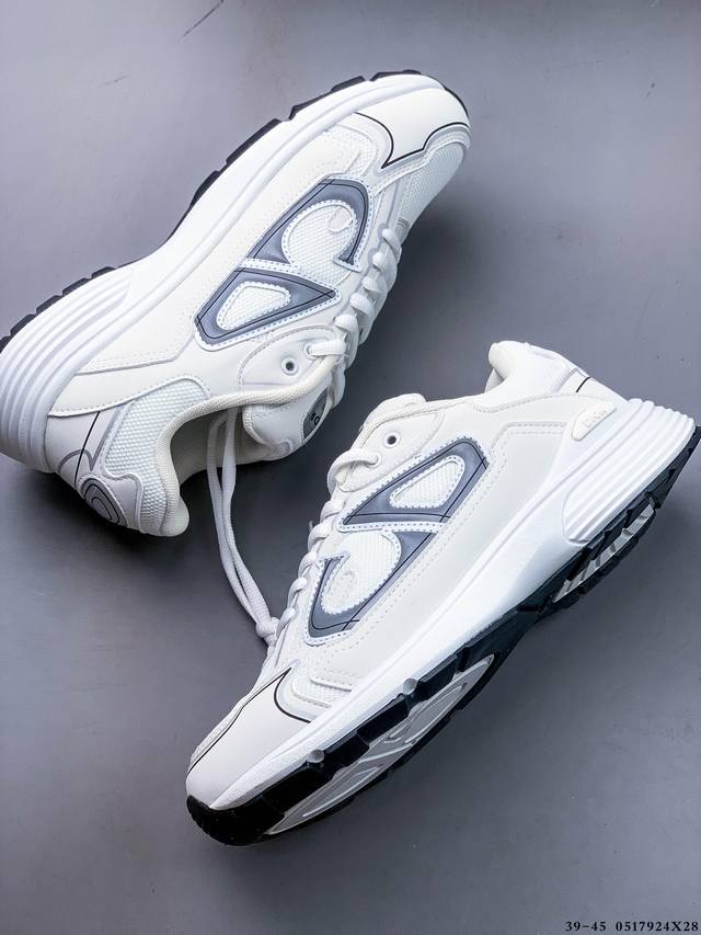b30运用了质感细腻的皮革与网眼布面材质拼接成鞋身 鞋身两侧贴有显眼的字母Cd表明身份 为Christian Dior缩写 鞋身多处线条勾勒细节 让鞋子整体看起来不那么单调 搭载奶油色Eva 橡胶混合大底 复古风十足