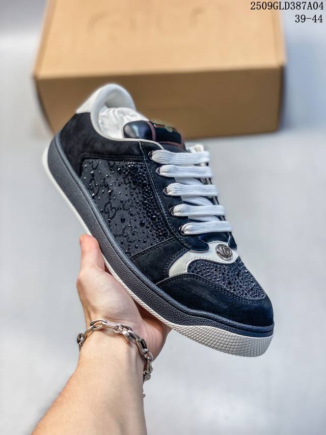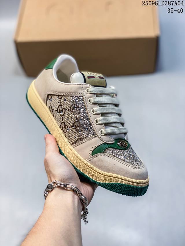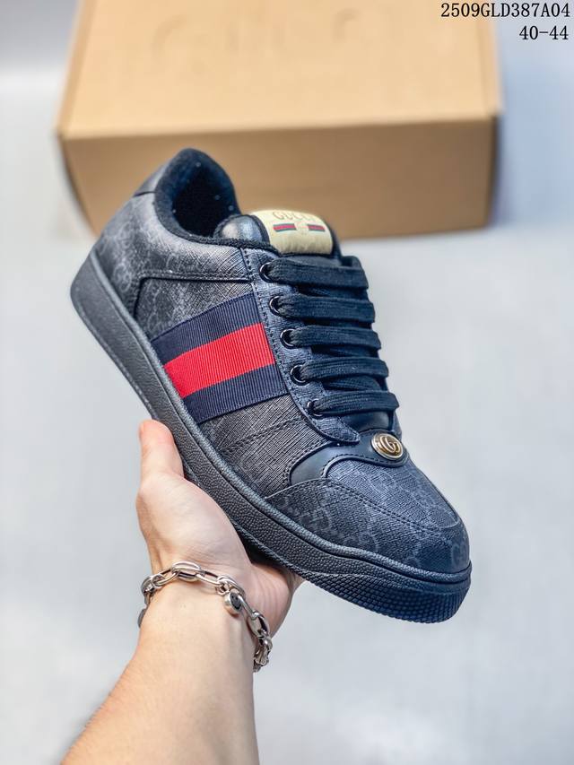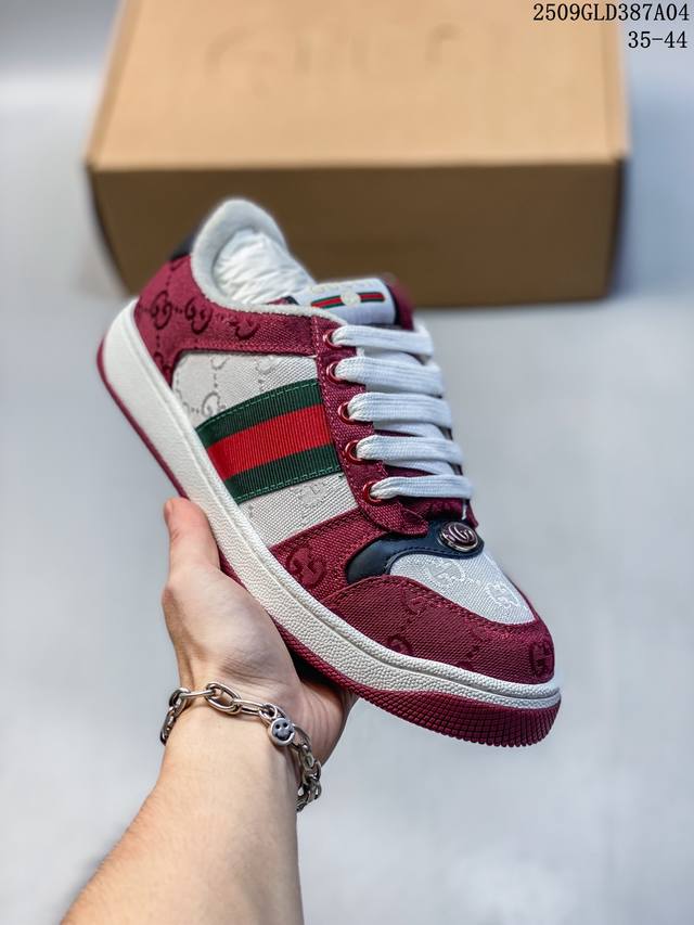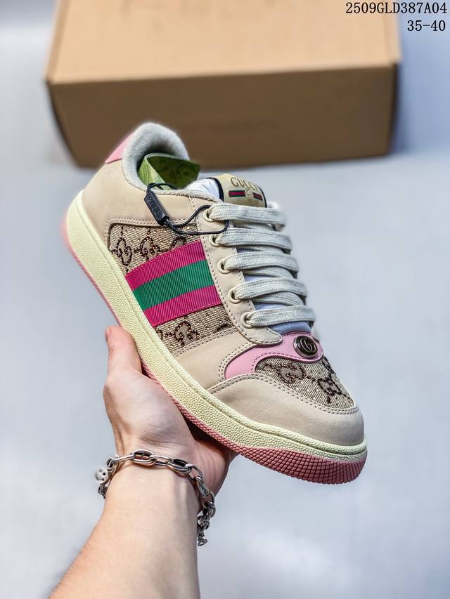 帝王版 古驰男女鞋 Gucci Screener系列做旧脏脏鞋 时尚厚底增高复古板鞋潮运动鞋,复古学院风款式与融入怀旧运动服风格的面料风靡数十年,不同风格演绎出的协奏之曲为 早春系列提供了丰富灵感。这款运动鞋以70年代经典运动鞋为灵感原型,侧面饰有老花饰面,复古Gucci标识经过特殊处理,整体呈现做旧效果。复古风格尼龙织带,帆布细节,毛巾绒内里,加厚鞋底,经过特殊处理,营造复古做旧效果,饰金属双G椭圆形珐琅细节,标签上装饰Gucci复古标识,加厚双色鞋底 增高效果明显 意大利创作!