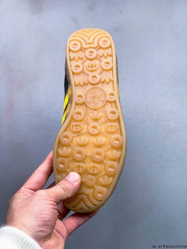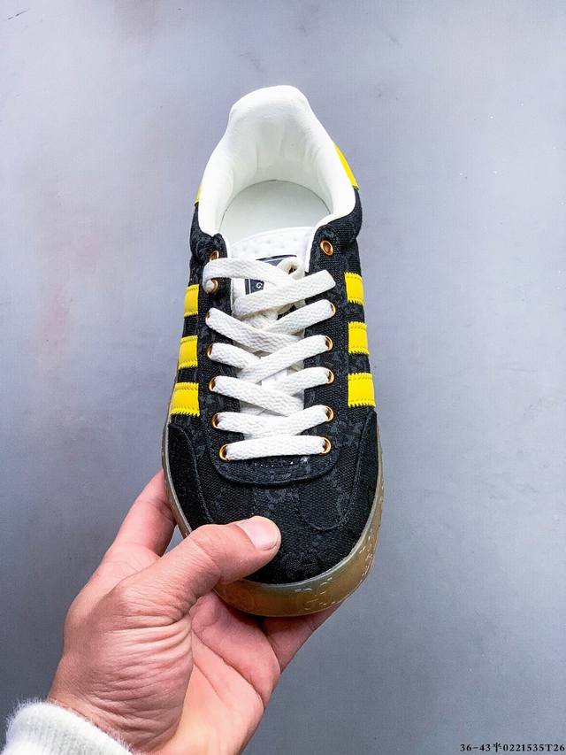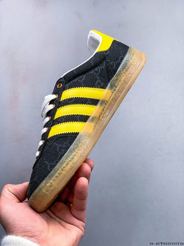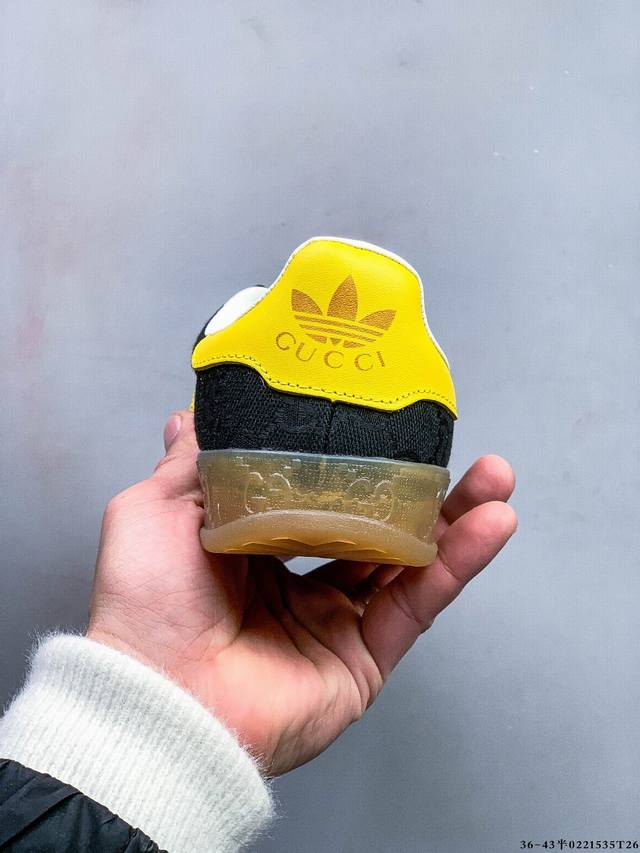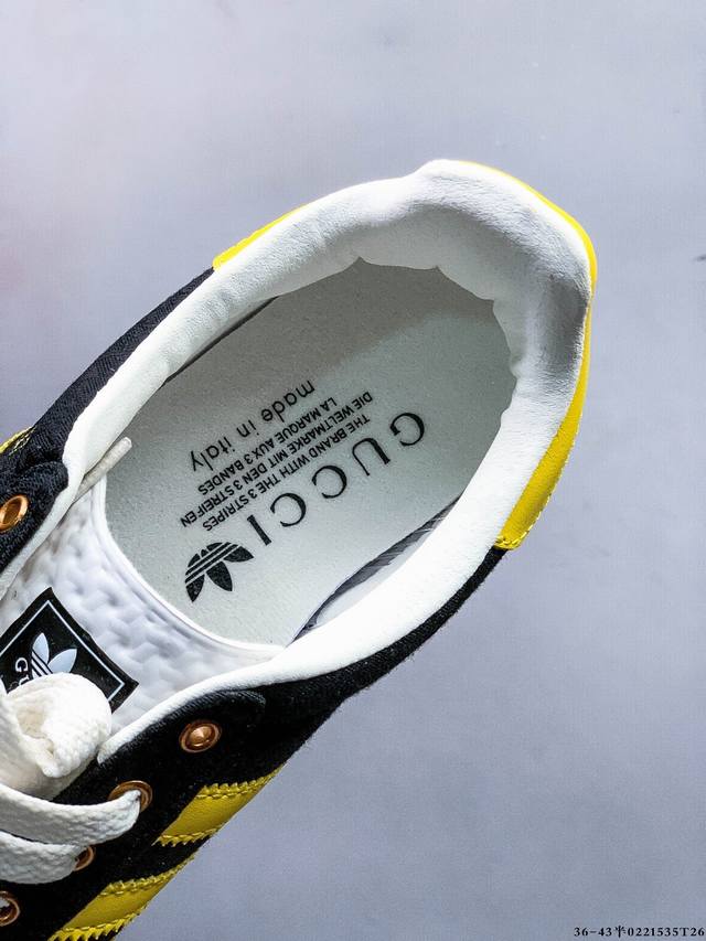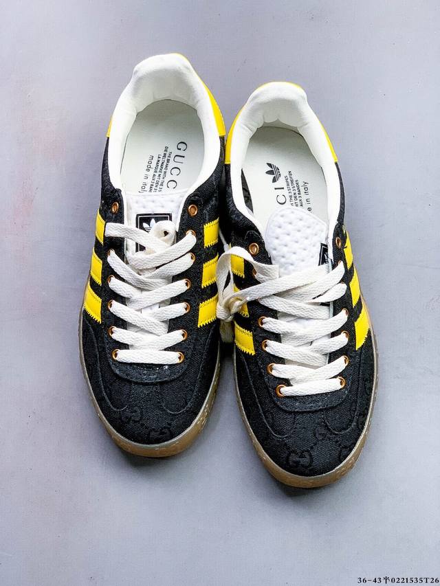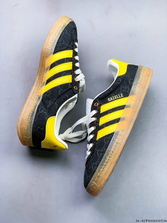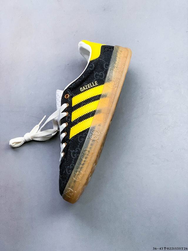 最新跨界联名Gucci X Adidas Originals Gazelle Esquisite Gucci 意大利奢侈品牌-古驰 古奇X 德国运动品牌阿迪达斯 羚羊系列 白三彩 其中大家最关心的联名鞋款,也有了更多角度近览的机会。双方以 Adidas Originals Gazelle 以为蓝本,保留鞋身三线的同时,通过帆布、麂皮、仿蛇纹理和 Gucci Logo 元素等配色,释放出出多样的可塑性。大底方面则在后跟特别刻印有 Gucci 字样,彰显联名身份。0221535T26