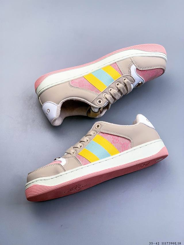 330 公司级Gucci古驰 Screener 胖丁 皮革 低帮圆头系带 时尚板鞋 做旧版 采用厚底结构 巧妙运用外观设计 配色和材质三重元素...
