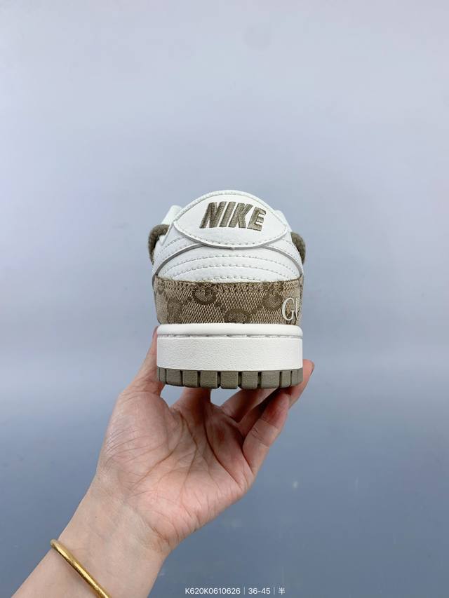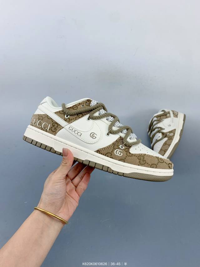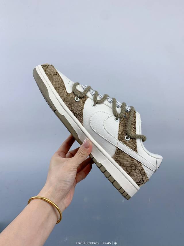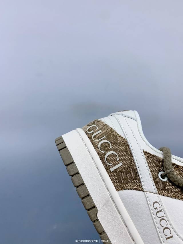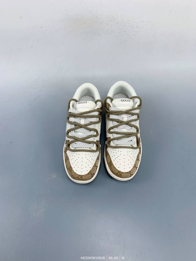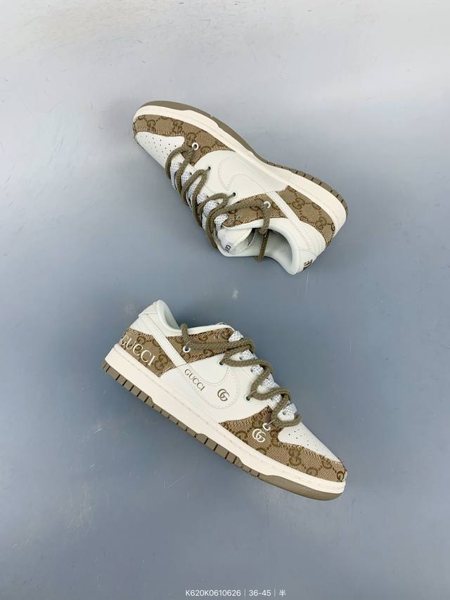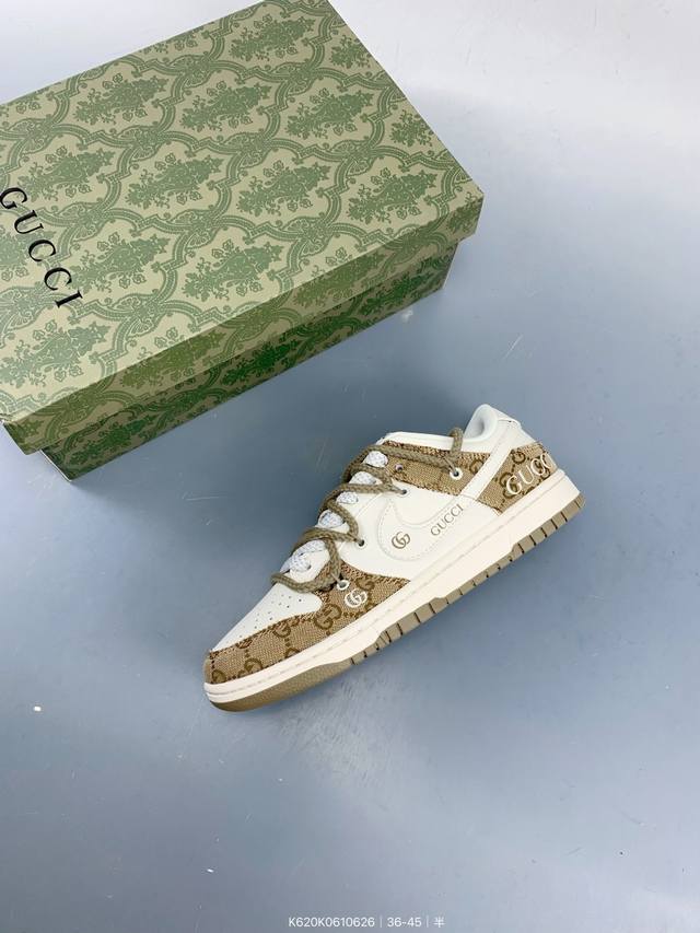 Gucci X Nike Dunk Sb Low 古驰古奇 X 耐克 Sb 低帮 卡其牛仔解构鞋带 鞋身整体以米白色皮革打造,搭配卡其色牛仔框架覆盖层,使鞋款十分百搭。