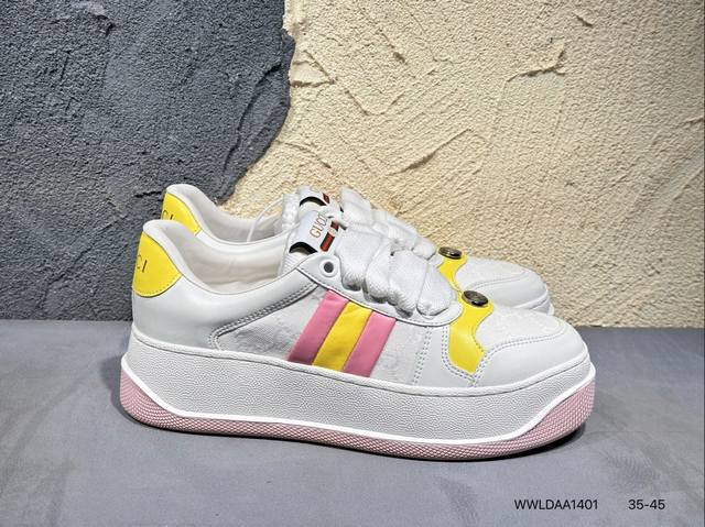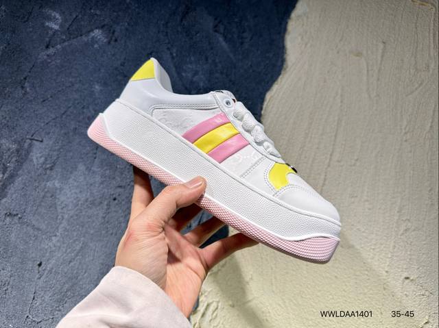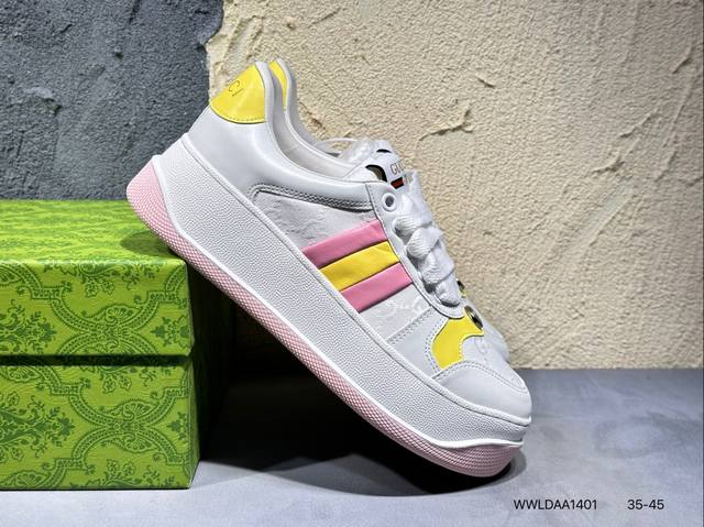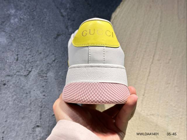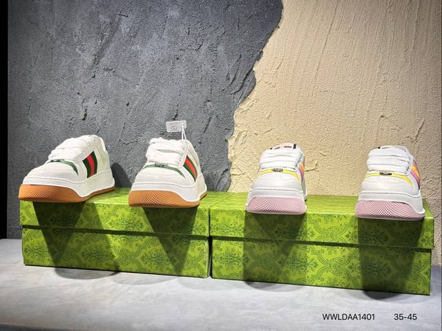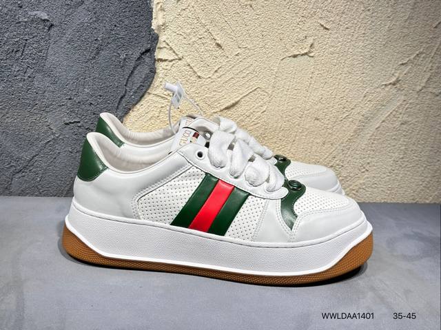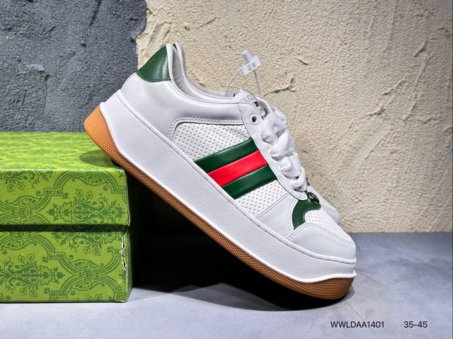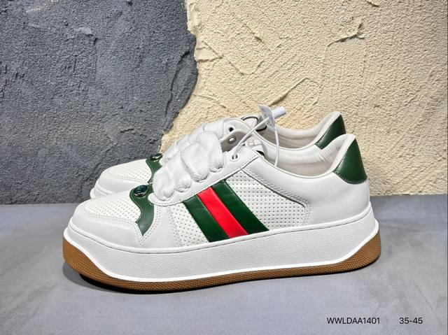 广东原产,超软小牛皮及纯棉提花布,真丝绸防尘鞋套袋,雪梨形超软沙绒纸团,超软皮内里脚垫,饰金属双G椭圆形珐琅细节意大利时装奢饰品牌·古驰Gucci Screener Gg Wayne Low 韦恩溶解系列低帮经典原型复古百搭老爹板鞋 431942 Wwldaa1401