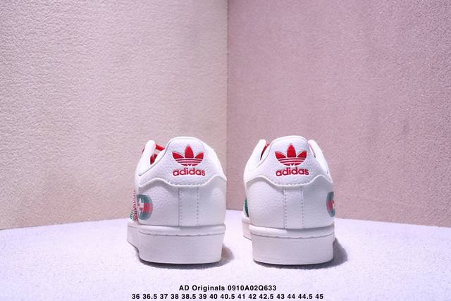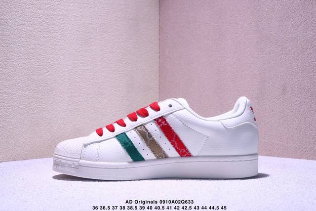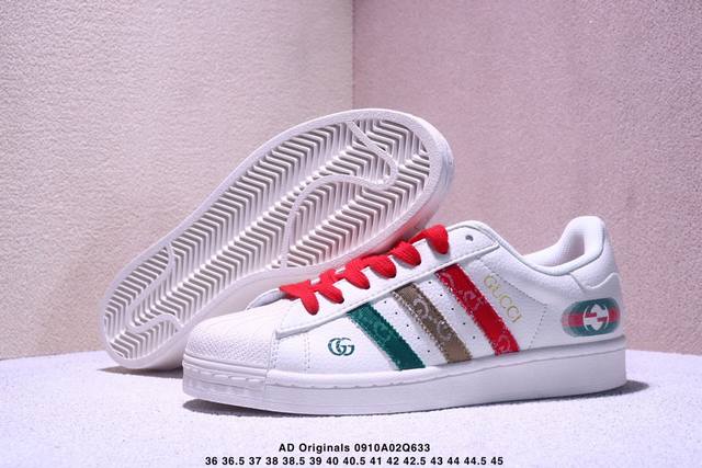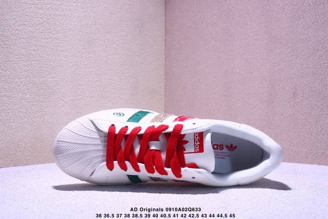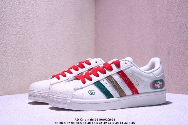 纯原 Clot X Ad Originals #贝壳头古驰联名限定 贴合柔软皮料红棕绿三道杠配色 ,这双鞋的整体设计思路和风格可以说很Clot。鞋款整体选用了易穿搭的白色作为主色调,而加厚的锯齿形外底以及标志性的贝壳头无疑把鞋款的独特属性进一步展现出来。