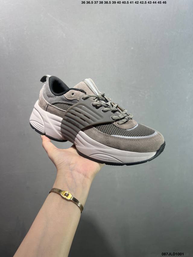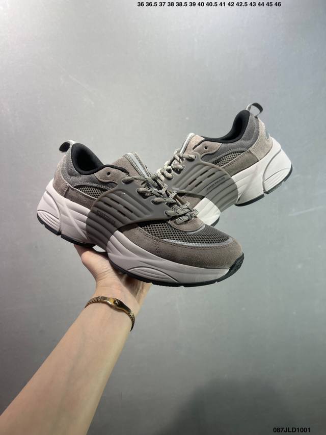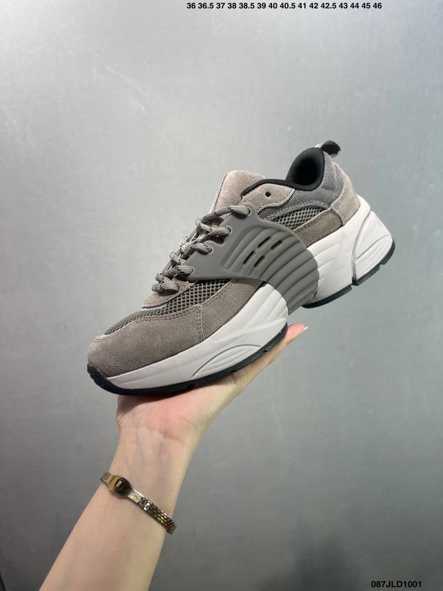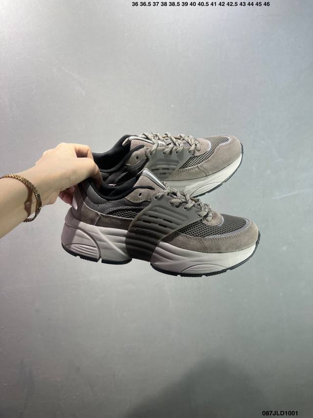 该鞋款从品牌复古跑鞋和现代前沿科技汲取灵感,并交错覆盖织物网眼、麂皮制作层次底座。细节处除了便利穿脱的拉环外,鞋款还附有保证穿着舒适性的厚实罗纹中底、穿孔侧笼、Eva泡棉等配置。Bx