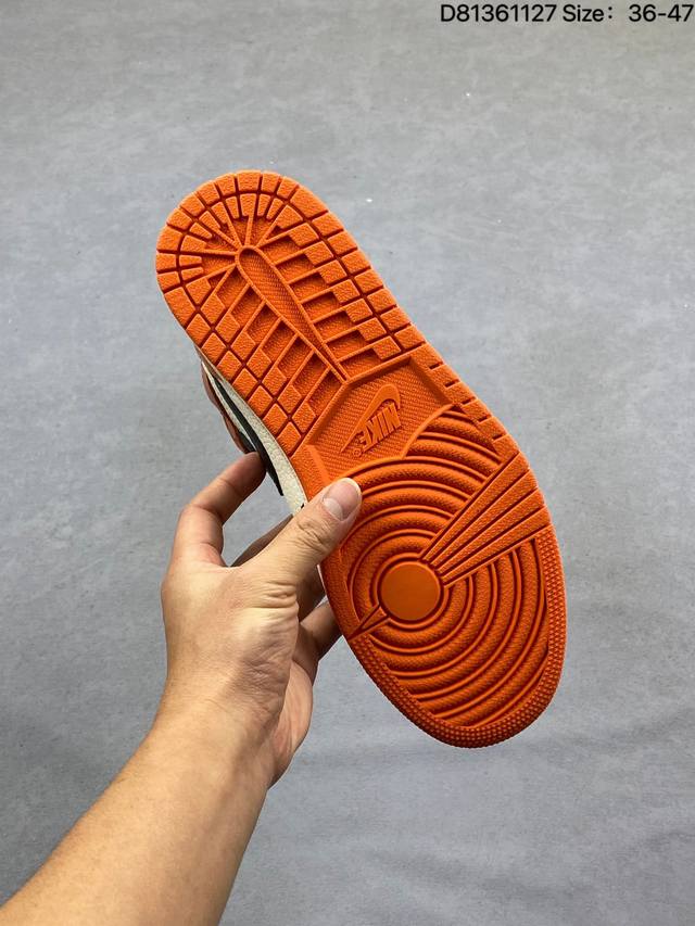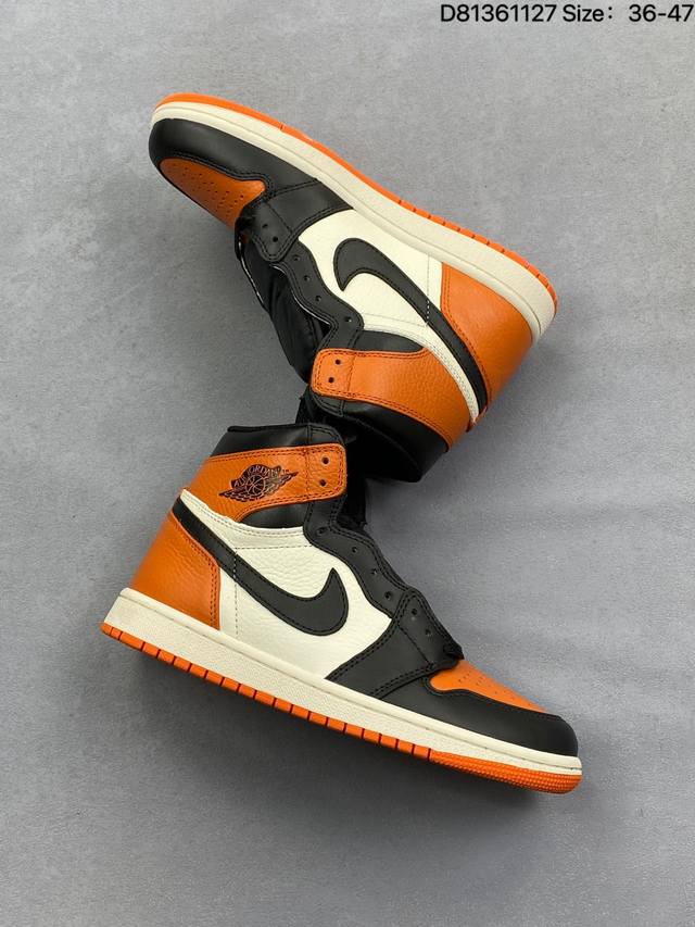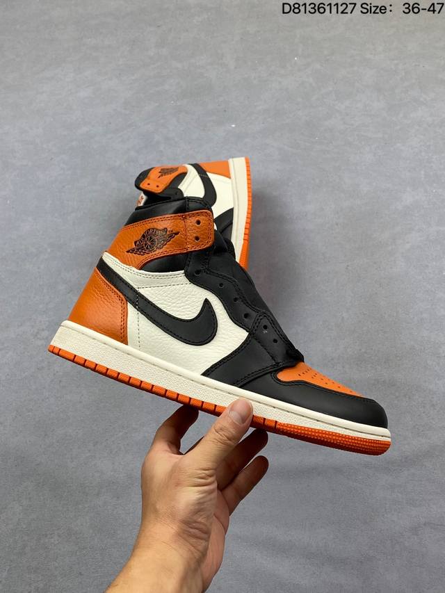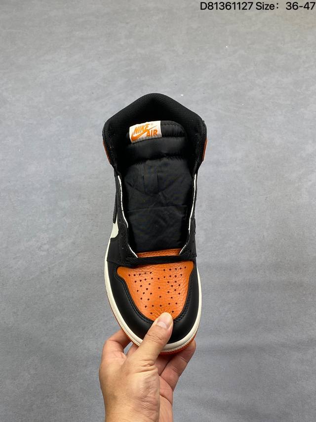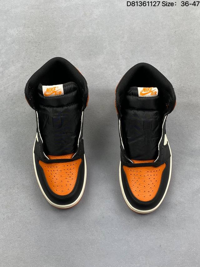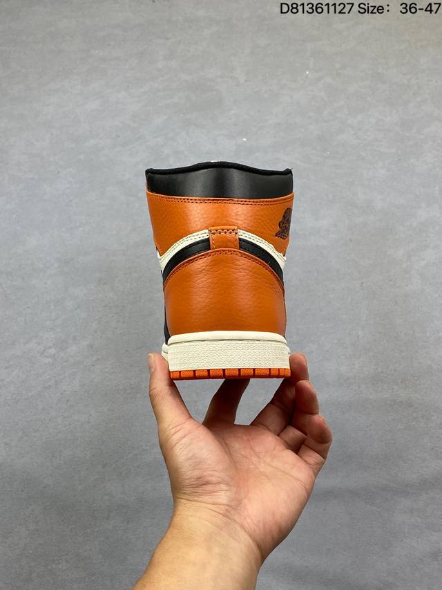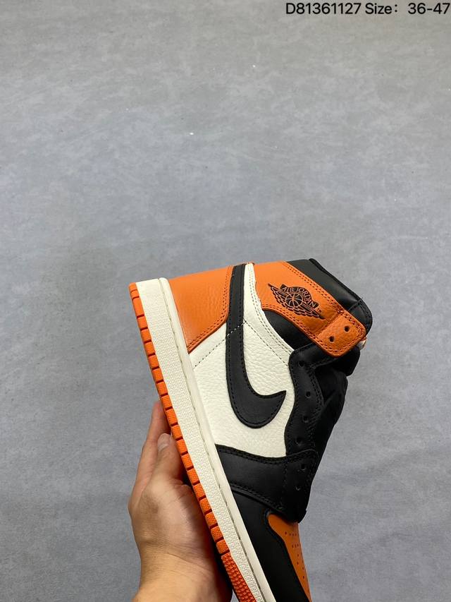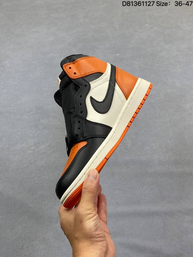 头层带半码 DDD Air Jordan 1 High Og Shattered Backboard 高帮 复刻扣碎篮板 Aj1 乔丹1代 Aj1 乔1 高邦 复刻黑扣碎 乔丹篮球鞋系列 设计灵感来源于乔丹在1985年意大利的一场表演赛中的一次传奇扣篮。当时,乔丹身穿橙色、黑色和白色球衣的他在一场表演比赛中,以一记强力扣篮直接击碎了篮板玻璃,这一幕成为了篮球史上的经典瞬间。而鞋款的配色灵感就汲取自Mj当时身着的Stefanel Trieste球衣,采用橙、黑、白三色配色设计,还原Mj球衣的色调,橙色尤为突