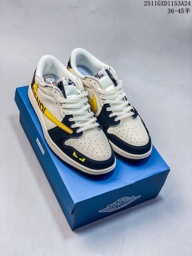 海外爆款限量发售! Travis Scott X Jordan 1 Low “芬迪联名 字母米黑黄” 高端定制 乔丹倒勾低帮休闲板鞋 大厂纯原品质出货 纯正版型
