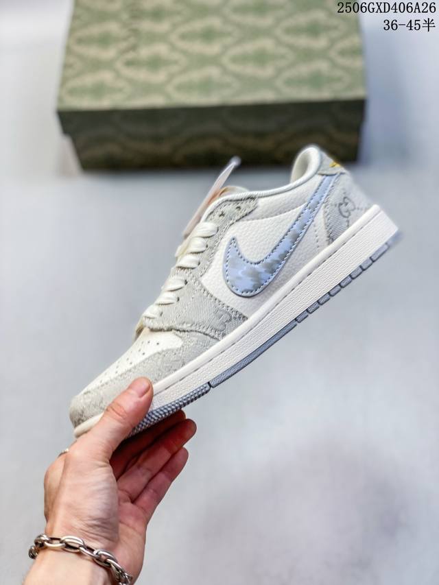 海外爆款限量发售!Travis Scott X Fragment Design X Jordan Air Jordan 1 Low Og Sp “古驰联名 烟灰帆布” 多方联名合作融合了Travi翻毛蓝勾S Scott 独特的音乐风格,藤原浩个性的设计风格以及Jordan品牌的经典元素 使其成为一双具有独特身份和价值的鞋子 清新而立体的外观加上联名标识更突出了其独特身份 这种配色方案显示出活力和时尚感 在视觉上引人注目 鞋身的质感和细腻的细节处理使其显得高端而格调十足 这款“倒钩”联名是设计与创意完美结合