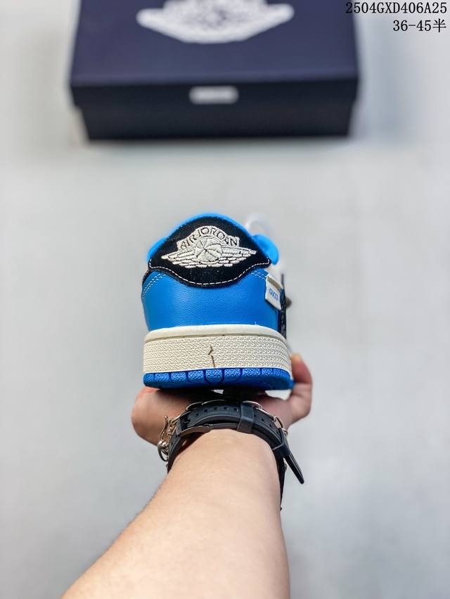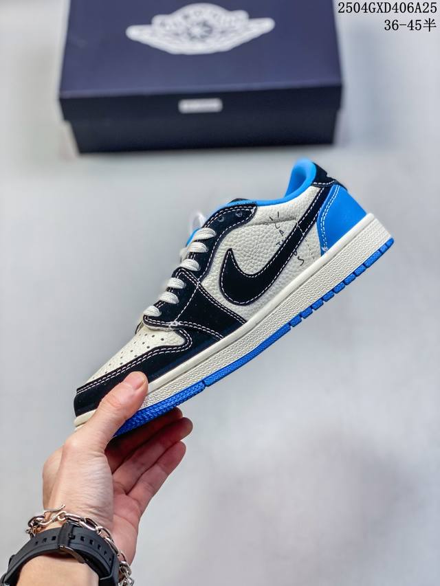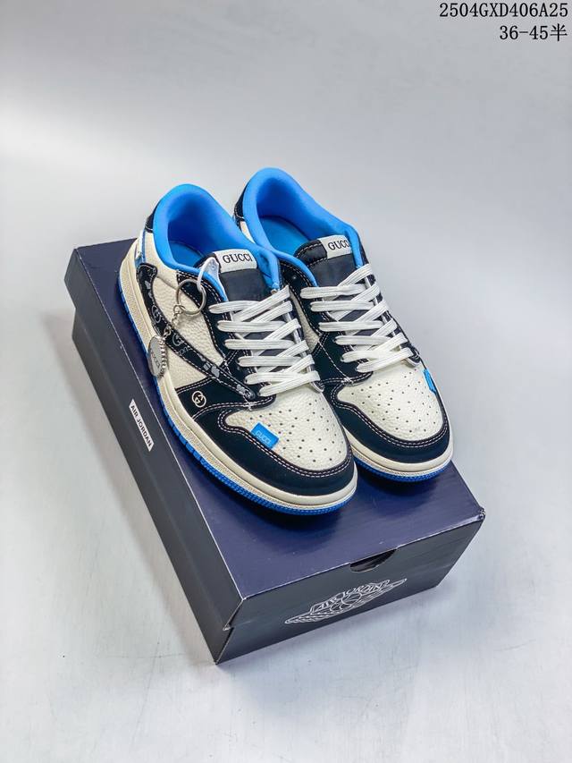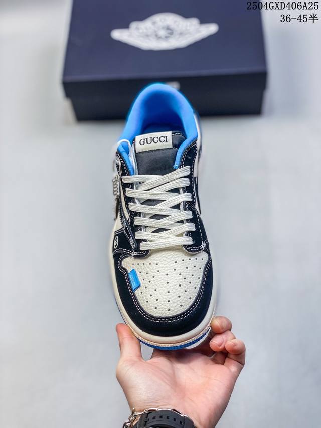 海外爆款限量发售!Travis Scott X Fragment Design X Jordan Air Jordan 1 Low Og Sp “古驰联名 蓝黑花勾” 多方联名合作融合了Travi翻毛蓝勾S Scott 独特的音乐风格,藤原浩个性的设计风格以及Jordan品牌的经典元素 使其成为一双具有独特身份和价值的鞋子 清新而立体的外观加上联名标识更突出了其独特身份 这种配色方案显示出活力和时尚感 在视觉上引人注目 鞋身的质感和细腻的细节处理使其显得高端而格调十足 这款“倒钩”联名是设计与创意完美结合