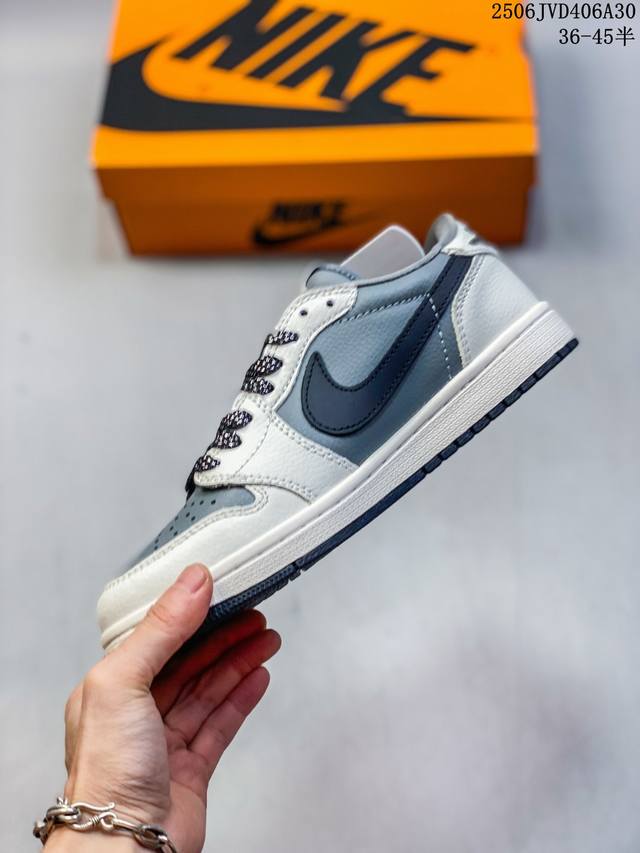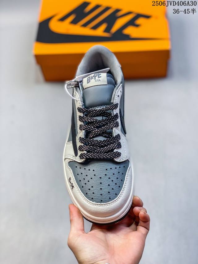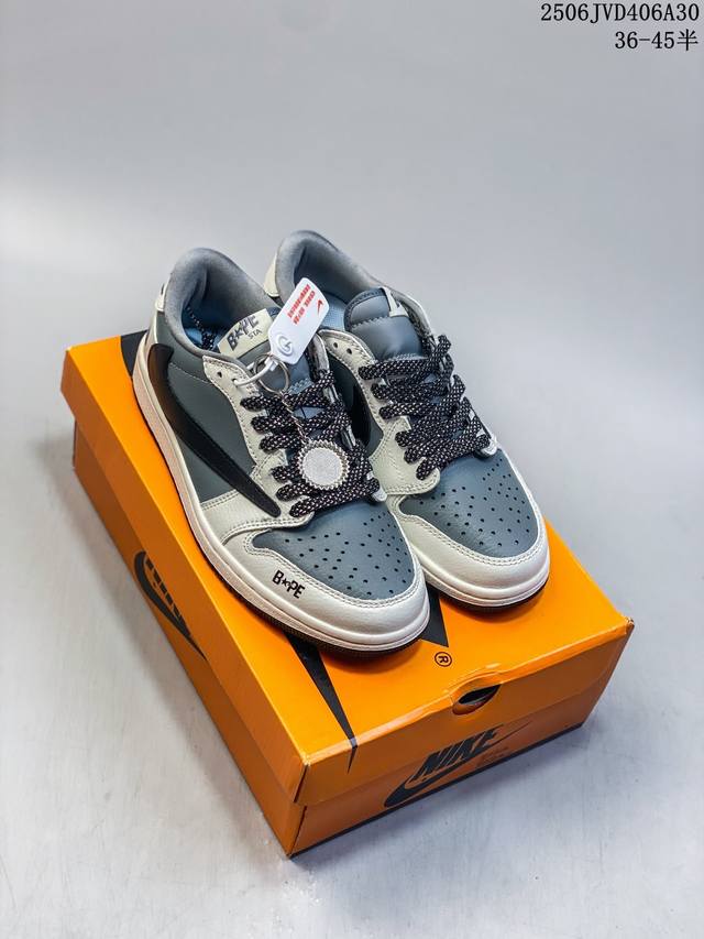 海外爆款限量发售!Travis Scott X Fragment Design X Jordan Air Jordan 1 Low Og Sp “Bape猿人头联名 灰黑勾” 多方联名合作融合了Travi翻毛黑勾S Scott 独特的音乐风格,藤原浩个性的设计风格以及Jordan品牌的经典元素 使其成为一双具有独特身份和价值的鞋子 清新而立体的外观加上联名标识更突出了其独特身份 这种配色方案显示出活力和时尚感 在视觉上引人注目 鞋身的质感和细腻的细节处理使其显得高端而格调十足 这款“倒钩”联名是设计与创意