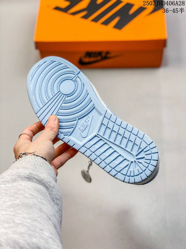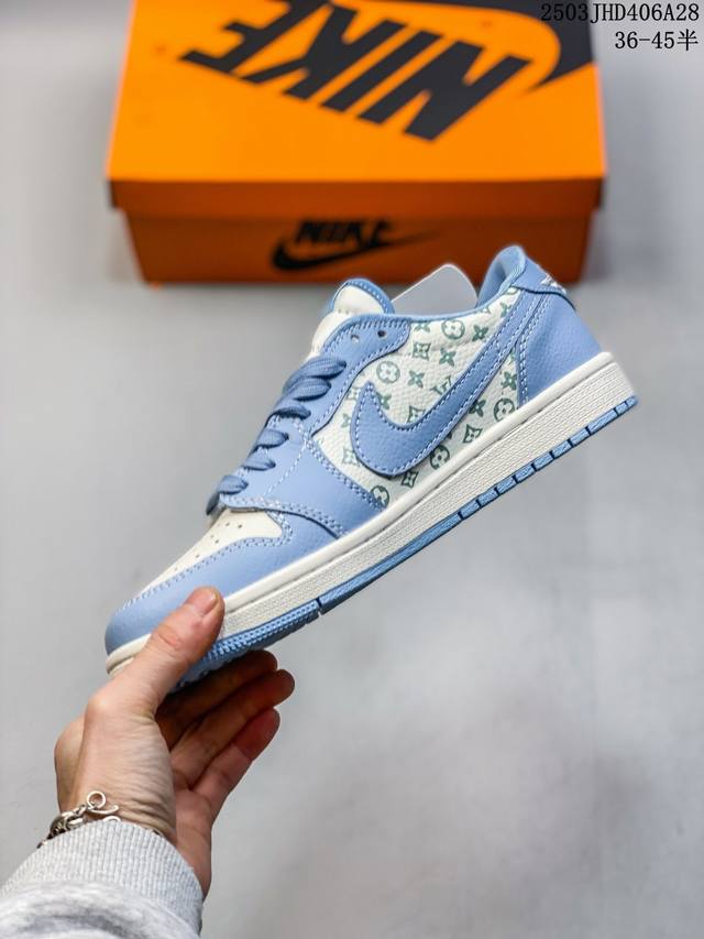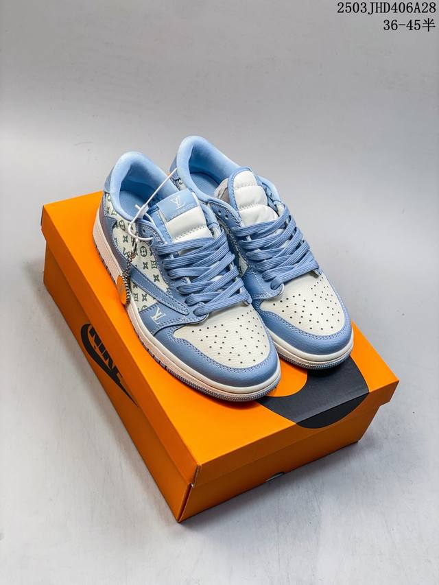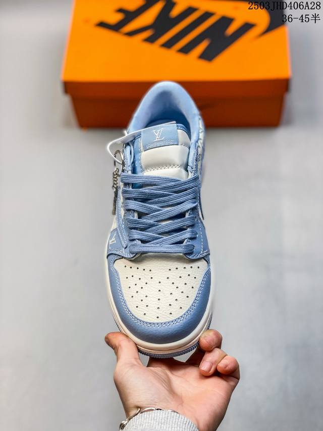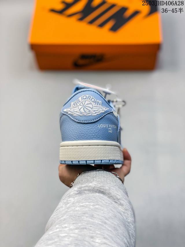 travis Scott X Fragment Design X Jordan Air Jordan 1 Low Og Sp “Lv联名——印花大学蓝” 多方联名合作融合了Travis Scott 独特的音乐风格,藤原浩个性的设计风格以及Jordan品牌的经典元素 使其成为一双具有独特身份和价值的鞋子 清新而立体的外观加上联名标识更突出了其独特身份 这种配色方案显示出活力和时尚感 在视觉上引人注目 鞋身的质感和细腻的细节处理使其显得高端而格调十足 这款“倒钩”联名是设计与创意完美结合 融合多方的个