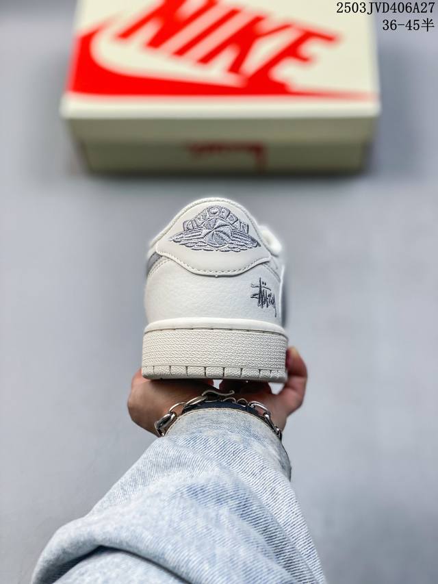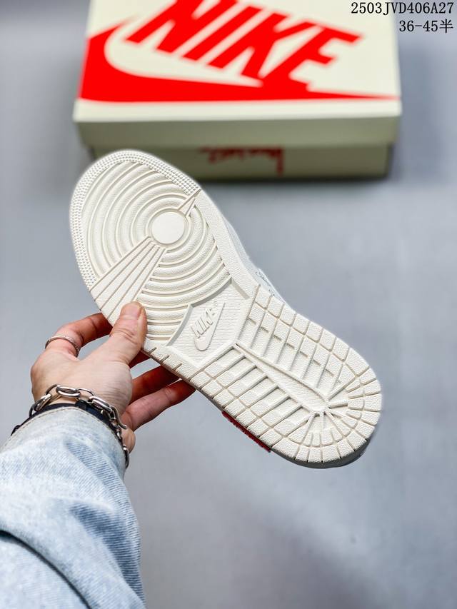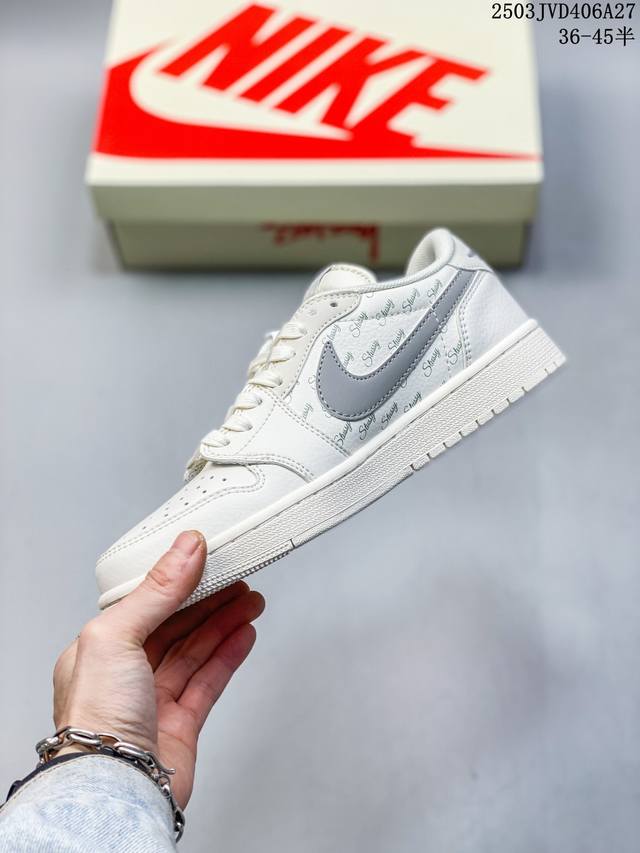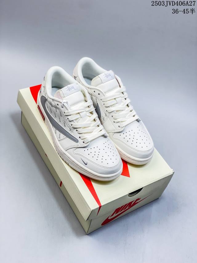 travis Scott X Fragment Design X Jordan Air Jordan 1 Low Og Sp “斯图西联名——英文米灰勾” 多方联名合作融合了Travis Scott 独特的音乐风格,藤原浩个性的设计风格以及Jordan品牌的经典元素 使其成为一双具有独特身份和价值的鞋子 清新而立体的外观加上联名标识更突出了其独特身份 这种配色方案显示出活力和时尚感 在视觉上引人注目 鞋身的质感和细腻的细节处理使其显得高端而格调十足 这款“倒钩”联名是设计与创意完美结合 融合多方的