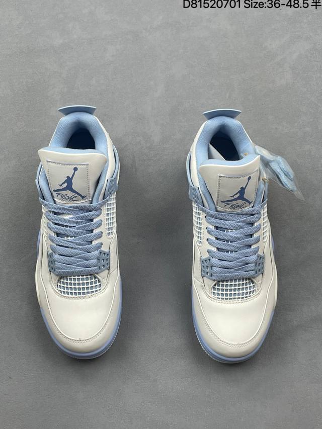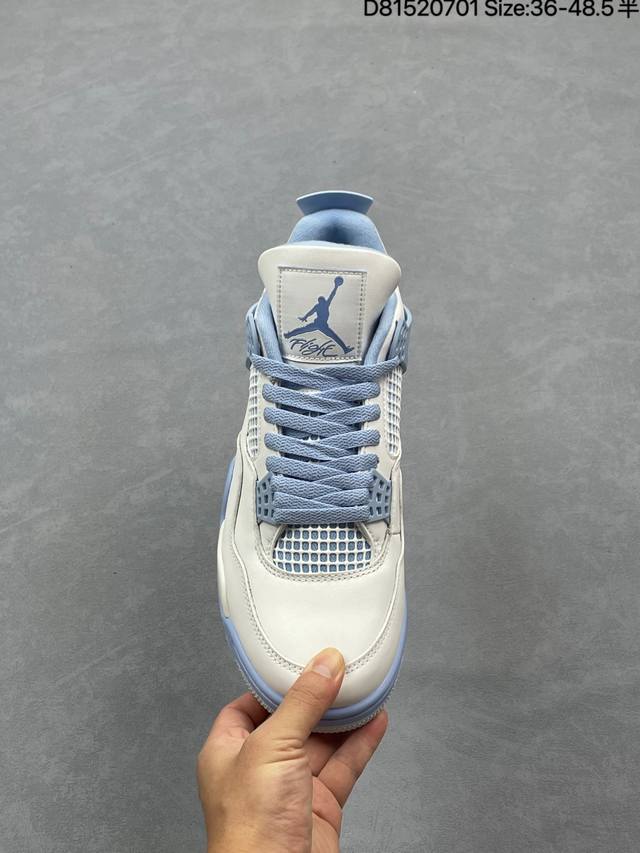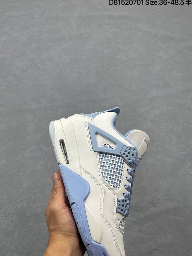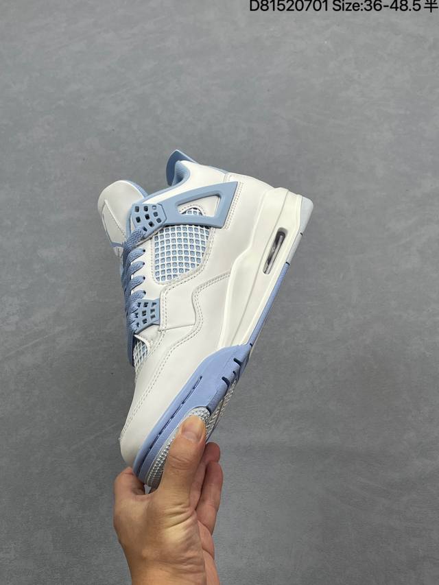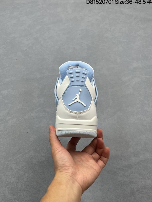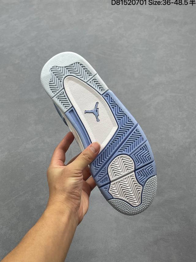 Air Jordan 4 Retro Aluminum 白蓝色 Aj4 乔丹4代 Aj4 乔4 白蓝色 乔丹篮球鞋系列 鞋身整体以白色皮革为主色调,辅以浅蓝色点缀,搭配蓝色的鞋带,让整鞋看起来更有整体感。鞋身中间添加着白色网格状透出蓝色内衬,鞋舌顶端白色的标签,以蓝色Jumpman Logo以及蓝色Flight刺绣字样,彰显球鞋身份;鞋带孔部位的Tpu装饰采用蓝色呈现,更具细节感。后跟位置的提环使用蓝色Tpu材质,给鞋身带来更多色彩层次感。后跟Jumpman Logo及外底迷你Jumpmman Logo分