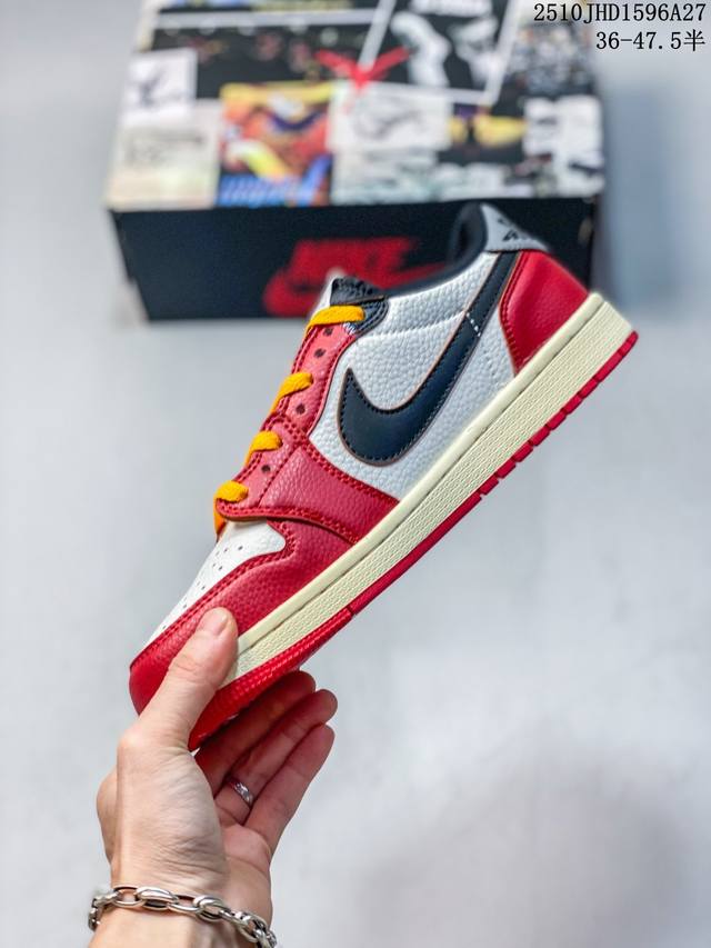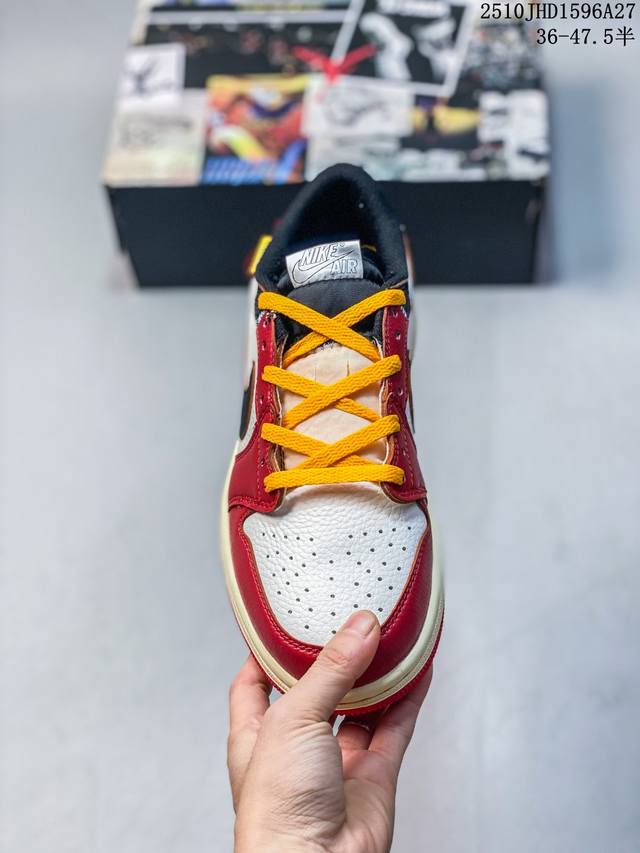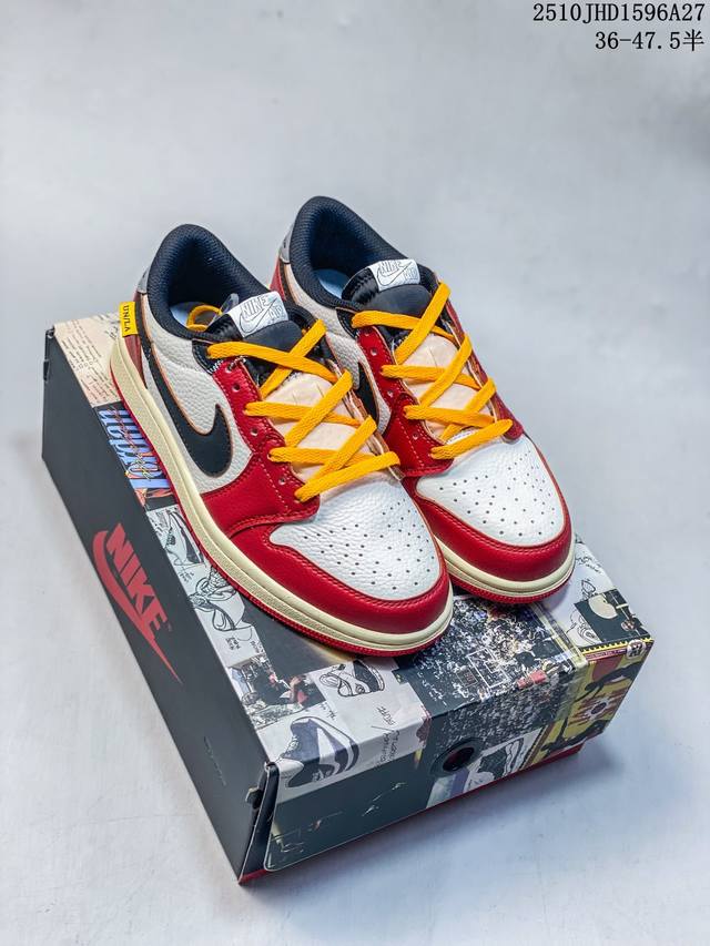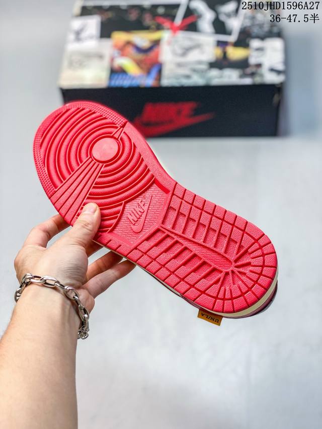 Fragment Design X Union X Jordan Air Jordan 1 Retro High Og Nrg 三方联名款 牛皮 舒适 防滑 高帮 复古篮球鞋 男女同款 Air Jordan 1于1985年推出,是耐克第一双以乔丹名字命名的篮球鞋,正是这双鞋,开启了一个时代。Air Jordan 1外形的灵感来自于在当年风靡一时的Airforce 1,同时降低中底厚度,减轻重量,增加贴地感,并采用了后掌Air Sole气垫和最经典的飞翼Logo来自于当时的Nike创意总监Peter Moo