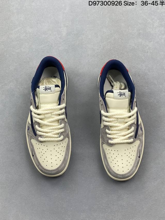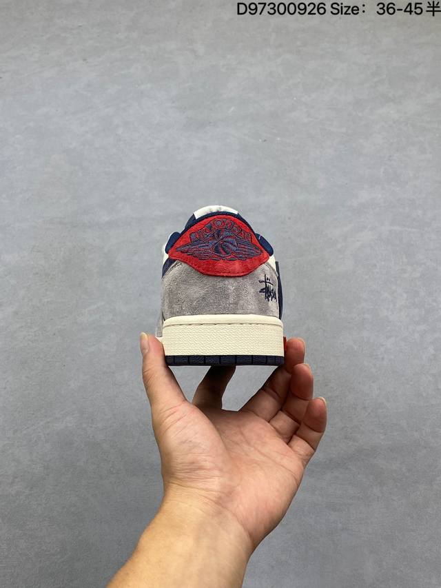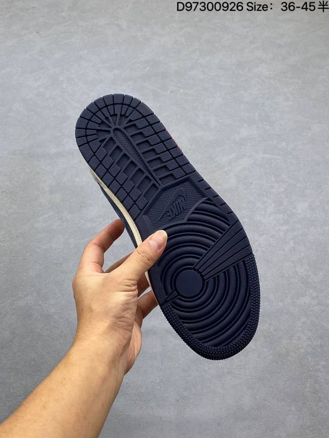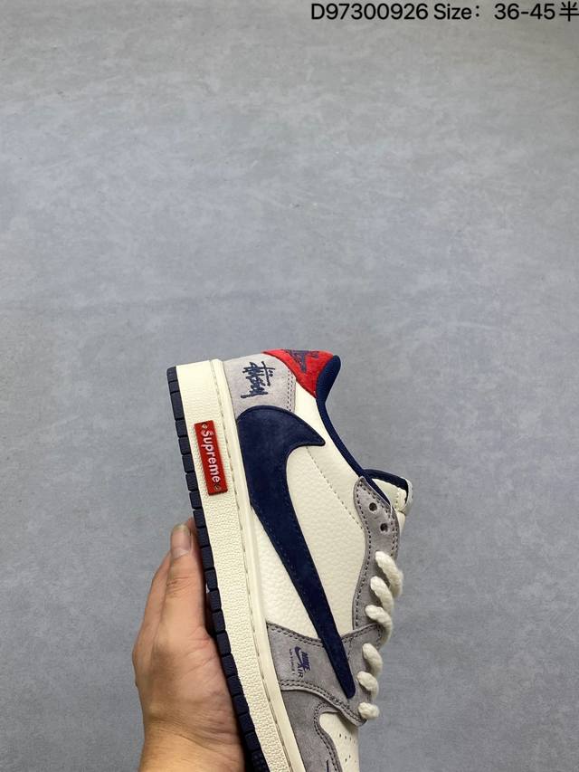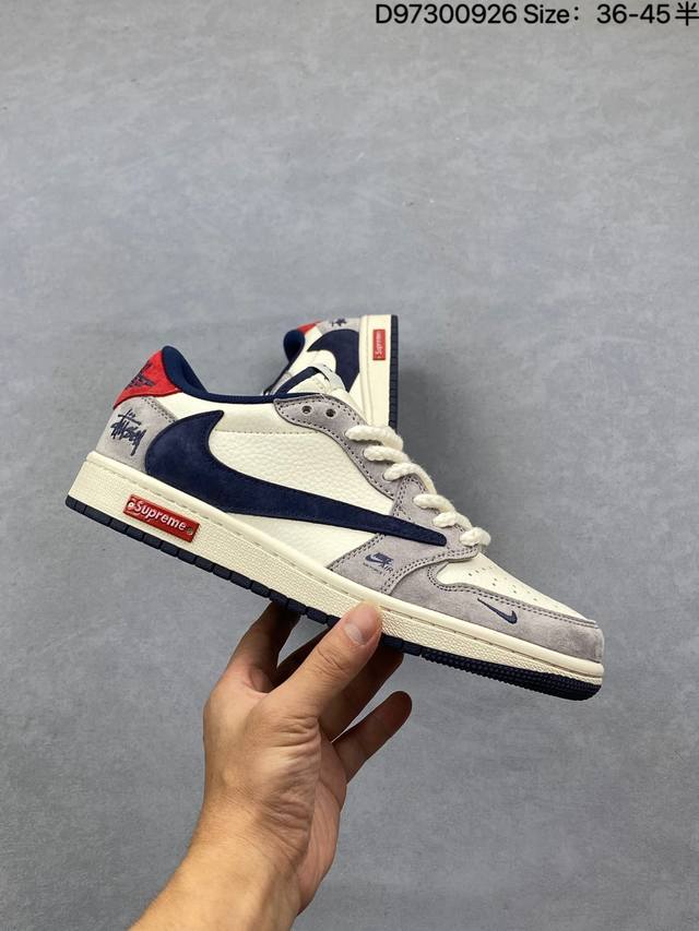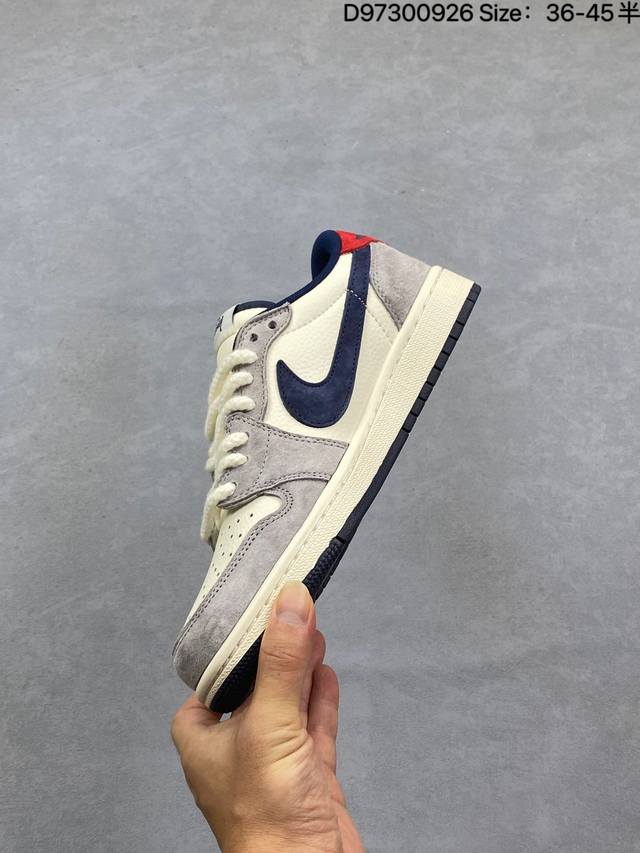 性价比原盒出货 全新的三方联名低帮倒钩鞋面延续了黑脚趾设计,整双鞋以全荔枝皮打造,腰身搭配白色 倒勾 ,再点缀上Travis Scott 标志性的Logo,后跟处以藤原浩最拿手的蓝色为主色调,完善极具Fragment Design的白蓝黑设计风格,左右脚分别以Travis Scott鬼脸和乔丹飞翼加以修饰,彰显出三方联名的奢华格调。