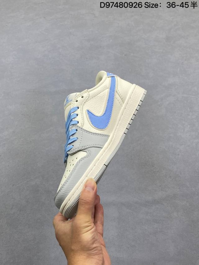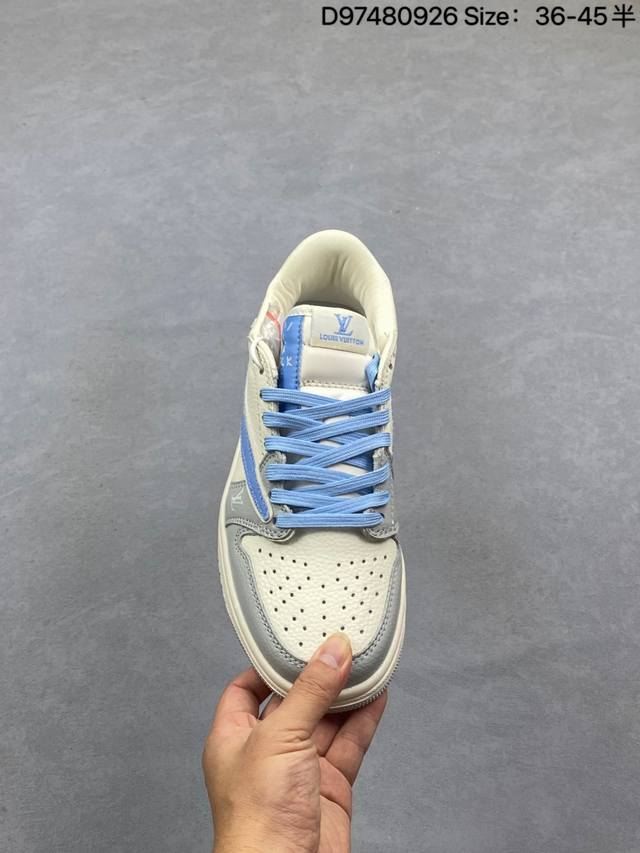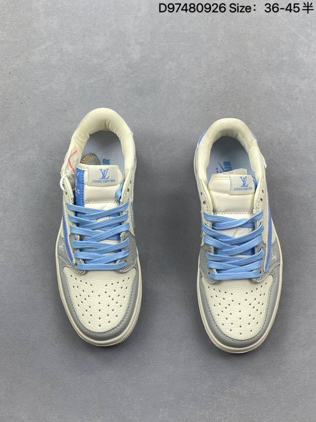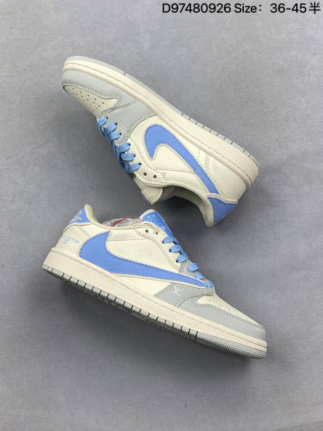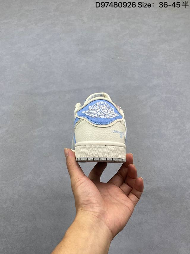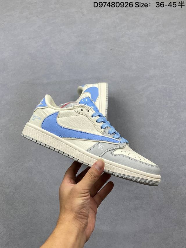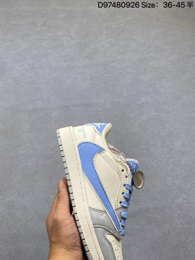 性价比原盒出货 全新的三方联名低帮倒钩鞋面延续了黑脚趾设计,整双鞋以全荔枝皮打造,腰身搭配白色 倒勾 ,再点缀上Travis Scott 标志性的Logo,后跟处以藤原浩最拿手的蓝色为主色调,完善极具Fragment Design的白蓝黑设计风格,左右脚分别以Travis Scott鬼脸和乔丹飞翼加以修饰,彰显出三方联名的奢华格调。