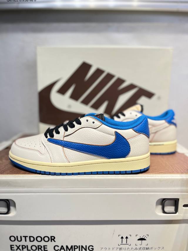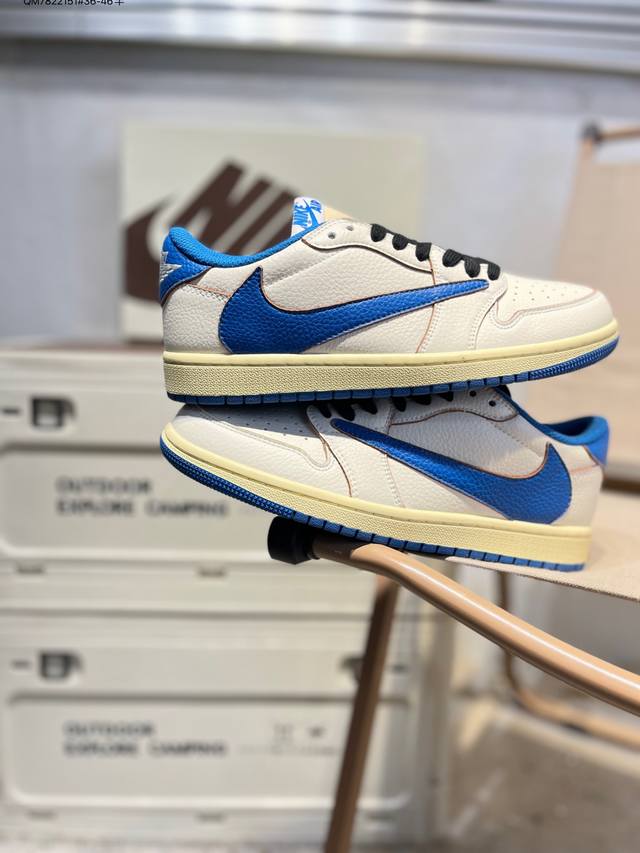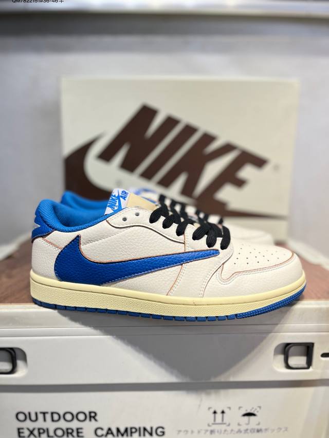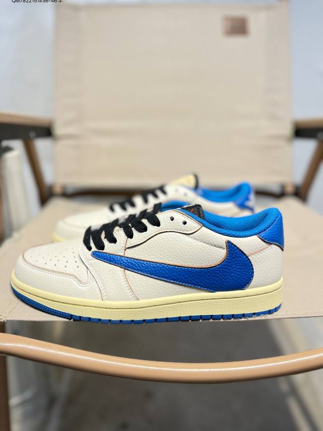 Fragment X Travis Scott X 冠军 Air Jordan 1 Low 三方联名倒钩 全新的三方联名低帮倒钩鞋面延续了黑脚趾设计,整双鞋以全