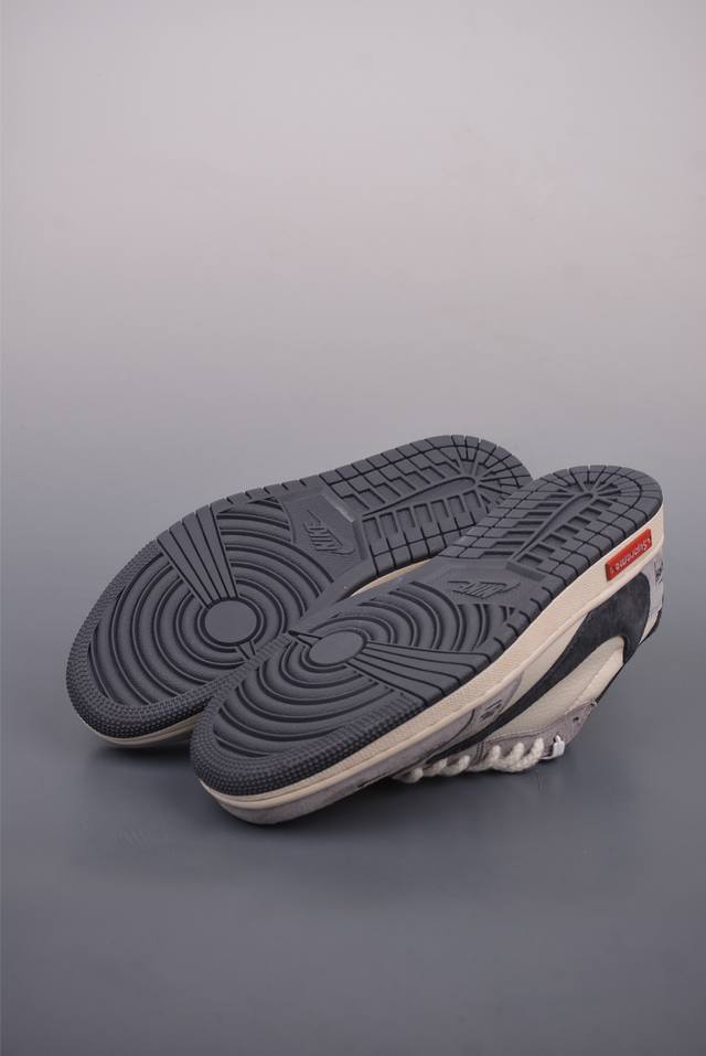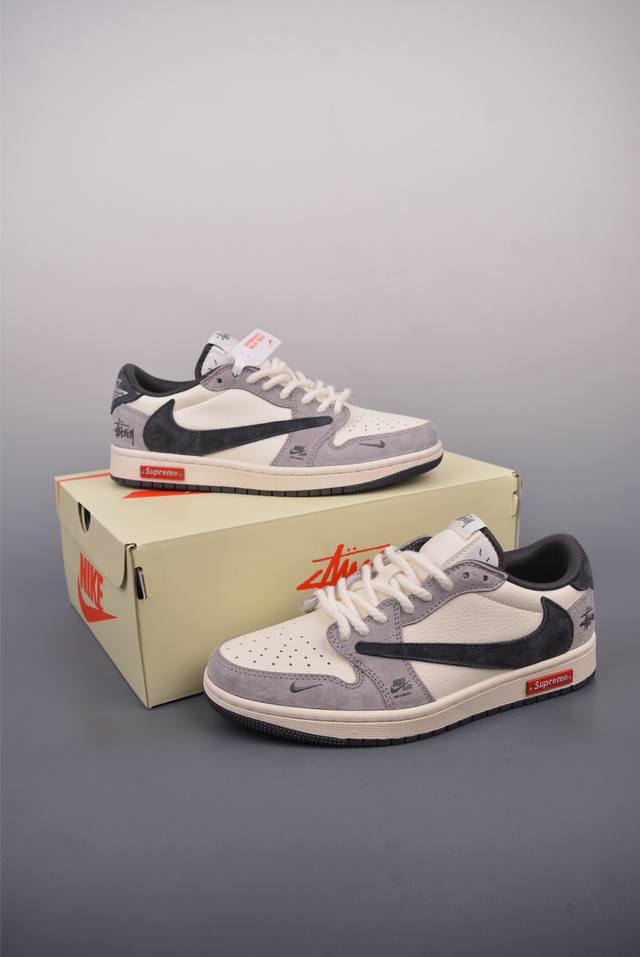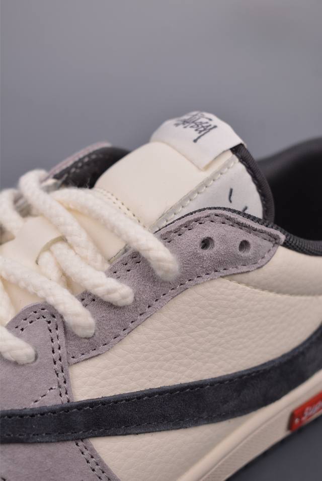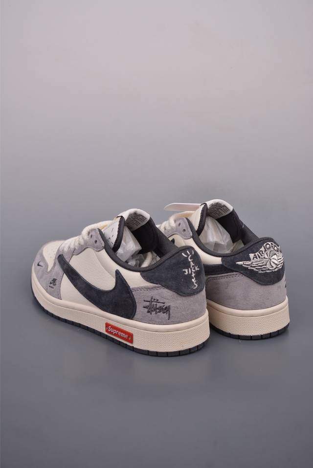 性价比原盒出货 全新的三方联名低帮倒钩鞋面延续了黑脚趾设计,整双鞋以全荔枝皮打造,腰身搭配白色「倒勾」,再点缀上Travis Scott 标志性的Logo,后跟处以藤原浩最拿手的蓝色为主色调,完善极具Fragment Design的白蓝黑设计风格,左右脚分别以Travis Scott鬼脸和乔丹飞翼加以修饰,彰显出三方联名的奢华格调。