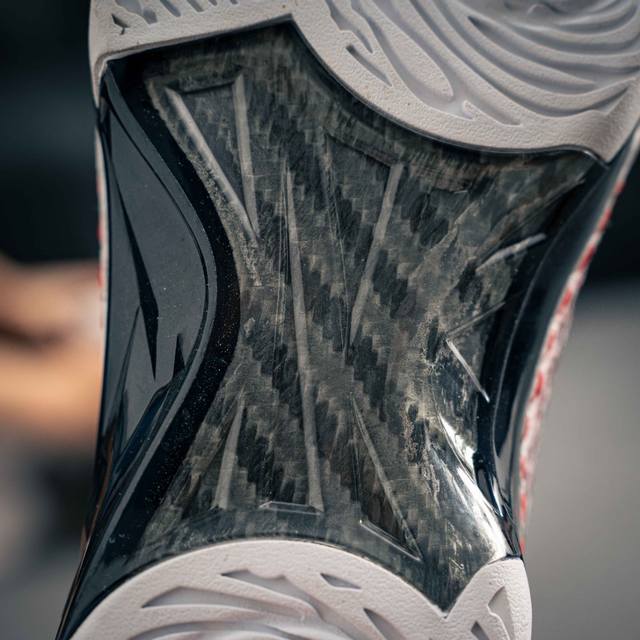 通过鞋身中部银色车线映出中底红色Tpu包裹框架