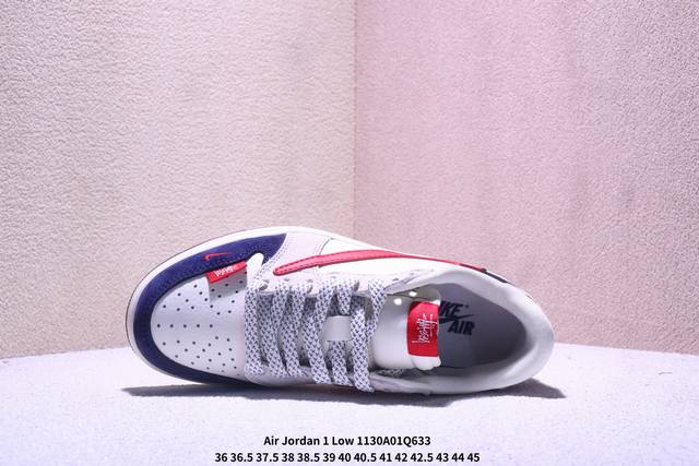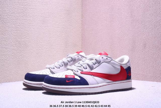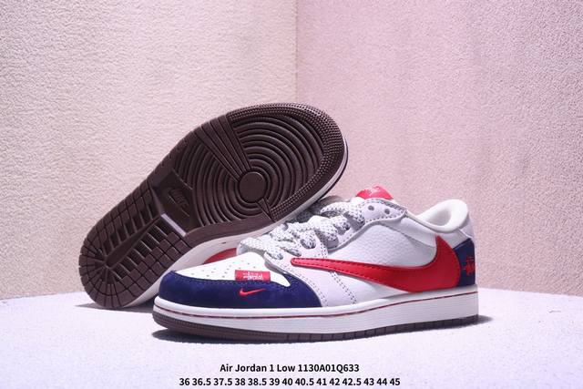 Travis Scott X Fragment Design X Jordan Air Jordan 1 Low Og Sp “斯图西联名 米蓝红勾” 多方联名合作融合了Travis Scott 独特的音乐风格,藤原浩个性的设计风格以及Jordan品牌的经典元素 使其成为一双具有独特身份和价值的鞋子 清新而立体的外观加上联名标识更突出了其独特身份 这种配色方案显示出活力和时尚感 在视觉上引人注目 鞋身的质感和细腻的细节处理使其显得高端而格调十足 这款“倒钩”联名是设计与创意完美结合 融合多方的个性风格是一