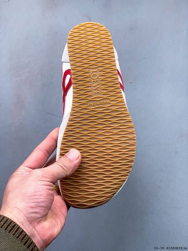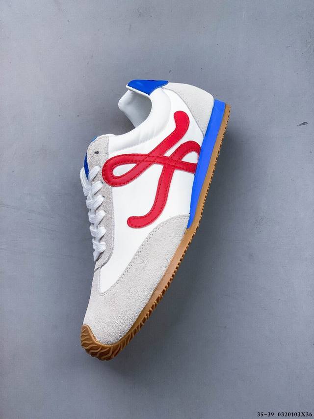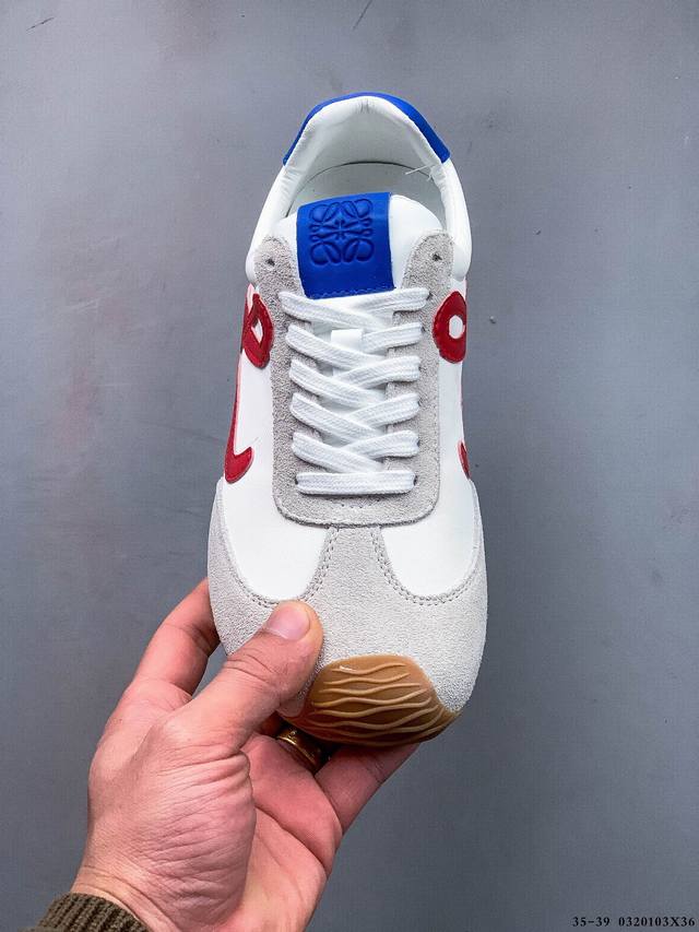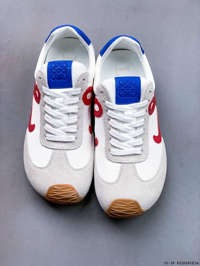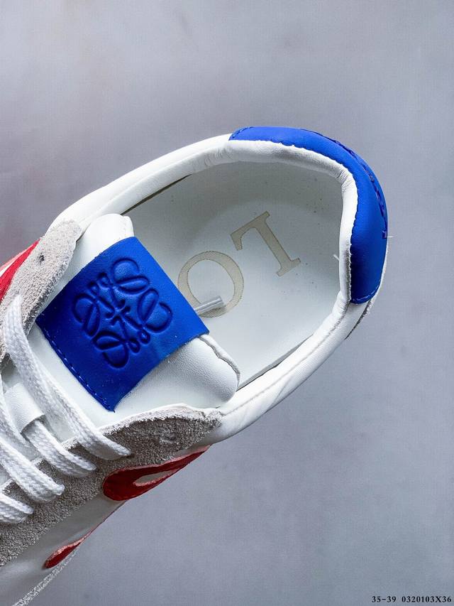 公司级!Loewe罗意威 Ballet Runner 2.0小牛皮 圆头系带 低帮 生活休闲鞋 罗意威全新版大头运动鞋Ballet Runner2.0,以其独特的设计和舒适度赢得了时尚界的青睐。这款鞋的鞋头设计充满趣味,脚后跟部分同样新颖,柔软且舒适,被誉为年度最舒适的暴走鞋。穿上它,仿佛如履平地,轻松享受运动的乐趣。鞋型简约利落,低帮设计展现时尚感,侧面带有品牌Logo的首字母,细节之处透露出品牌的高品质。这款鞋不仅舒适,还极具百搭性,无论是日常出行还是运动场合,都能展现出独特的时尚感。设计灵感