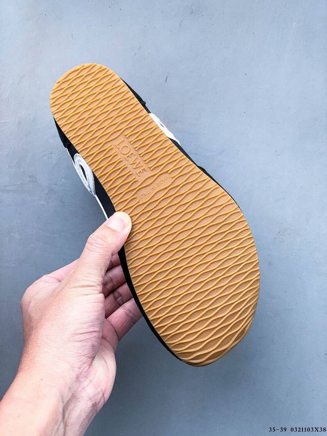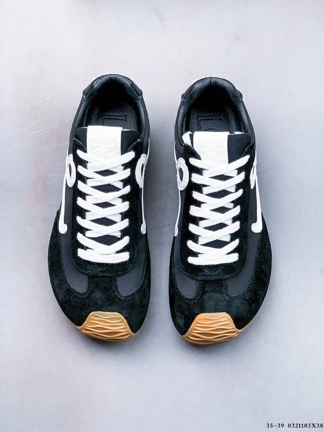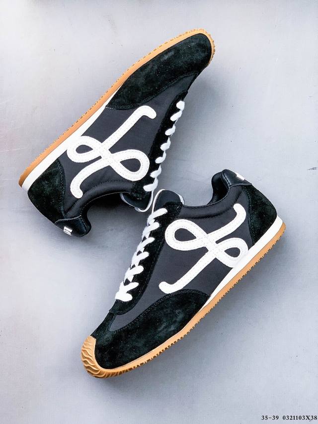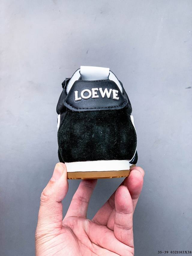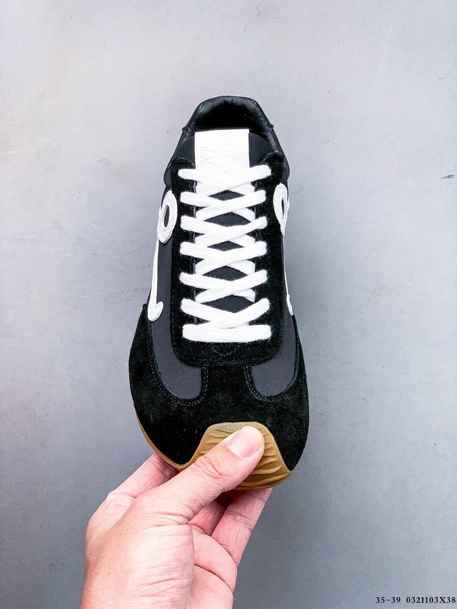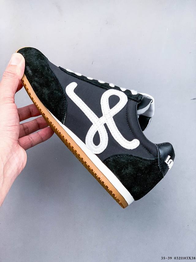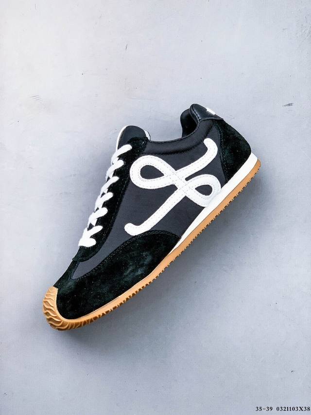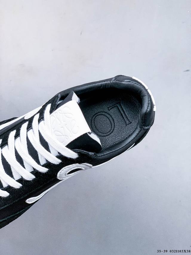 公司级!Loewe罗意威 Ballet Runner 2.0小牛皮 圆头系带 低帮 生活休闲鞋 罗意威全新版大头运动鞋Ballet Runner2.0,以其独特的设计和舒适度赢得了时尚界的青睐。这款鞋的鞋头设计充满趣味,脚后跟部分同样新颖,柔软且舒适,被誉为年度最舒适的暴走鞋。穿上它,仿佛如履平地,轻松享受运动的乐趣。鞋型简约利落,低帮设计展现时尚感,侧面带有品牌Logo的首字母,细节之处透露出品牌的高品质。这款鞋不仅舒适,还极具百搭性,无论是日常出行还是运动场合,都能展现出独特的时尚感。设计灵感