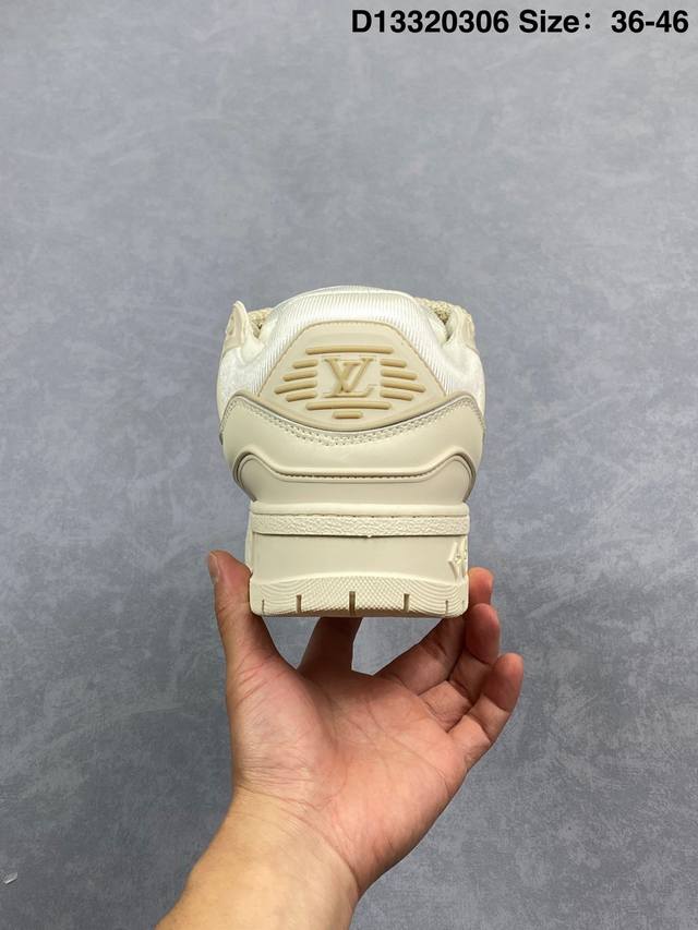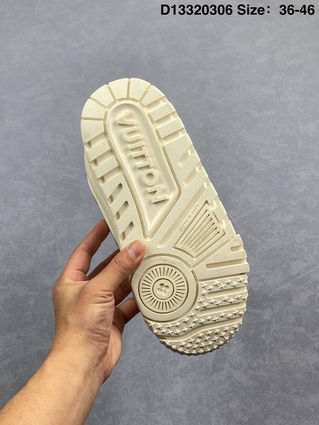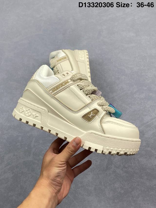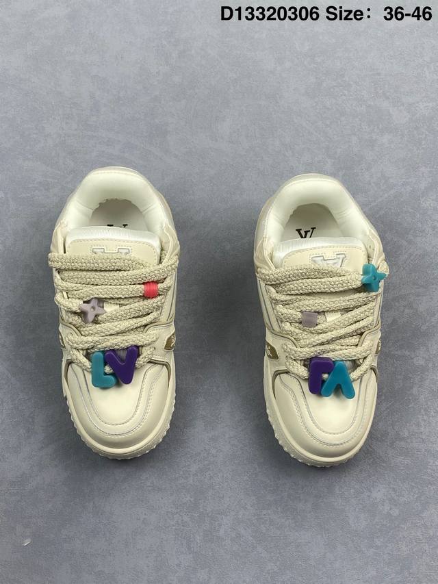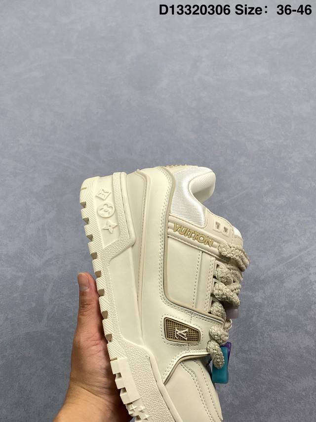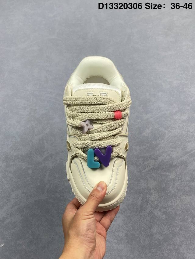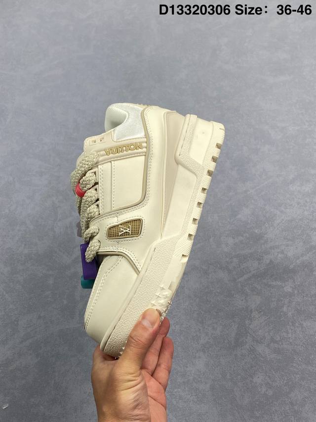 Lv Trainer Maxi 小胖丁系列面包鞋 驴牌23S时尚走秀款 原版购入开发历时半年开发打造 原版完美楦型 多次调试 达到还原99% 鞋面独家订制细柔小牛皮 厚实织物鞋带 独家私模超轻Tpu大底 原配扣子串珠 正确原装黄色鞋盒 正确中底印花 鞋面印花3D高频深度立体 全鞋电脑针车 紧密相连 针距密度一致 皮面裁剪部位 统一油边封口工艺 备受瞩目火热面包鞋再次拉满流量 各地网红上脚 立体饱满的彩色面包鞋身 超大版型重新诠释了 Virgil Abloh大热Lv运动时装鞋 完美增高5Cm S