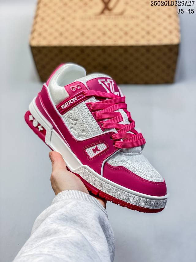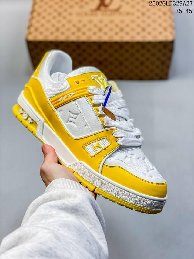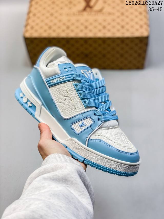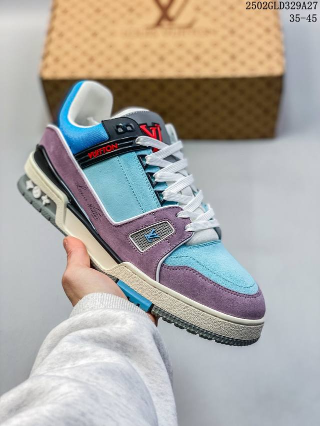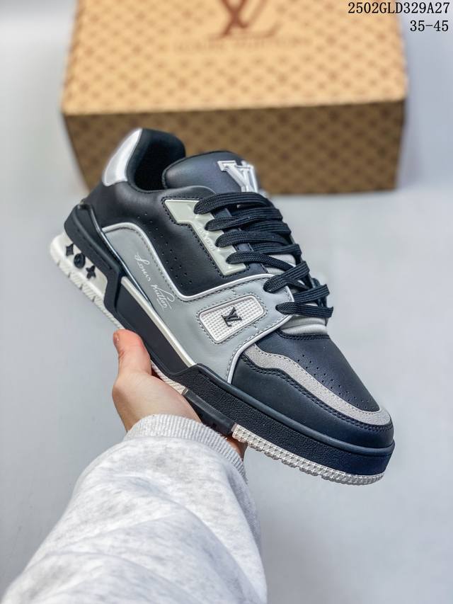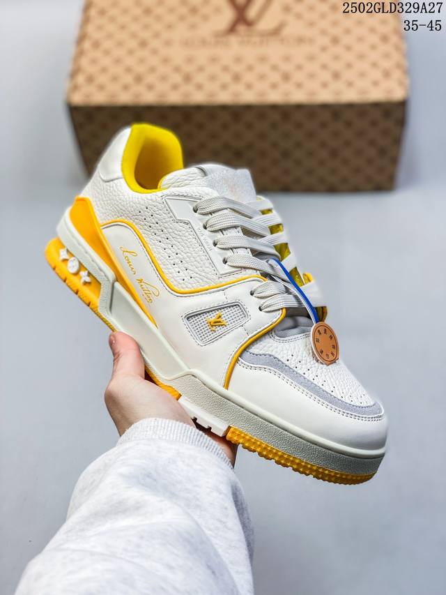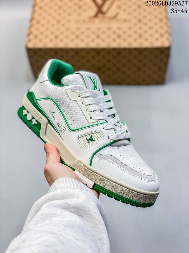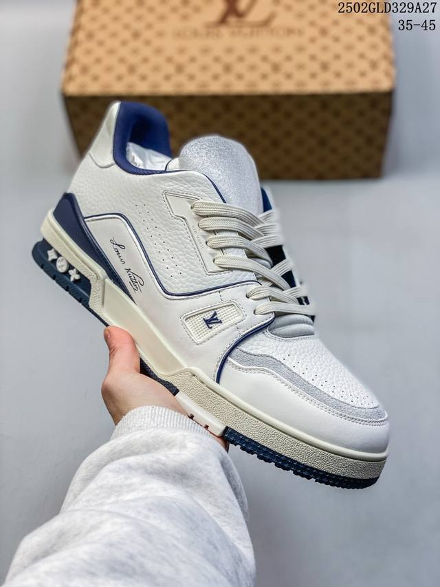 广东原产#升级厚实抽屉礼品鞋盒及包装说明书防尘布袋物件 附送官方快递加固彩色涂鸦包装大礼盒 #采用荔枝纹头层皮组合粒面头层皮鞋面材质#嵌入超软脚感Eva物料鞋垫#后跟耐弯折滴塑支撑片#外置Tpr光泽组合隔色鞋底法国巴黎百年奢侈品牌Lv路易威登Louis Vuitton Trainer Sneaker Low 运动系列低帮复古百搭休闲运动文化篮球板鞋