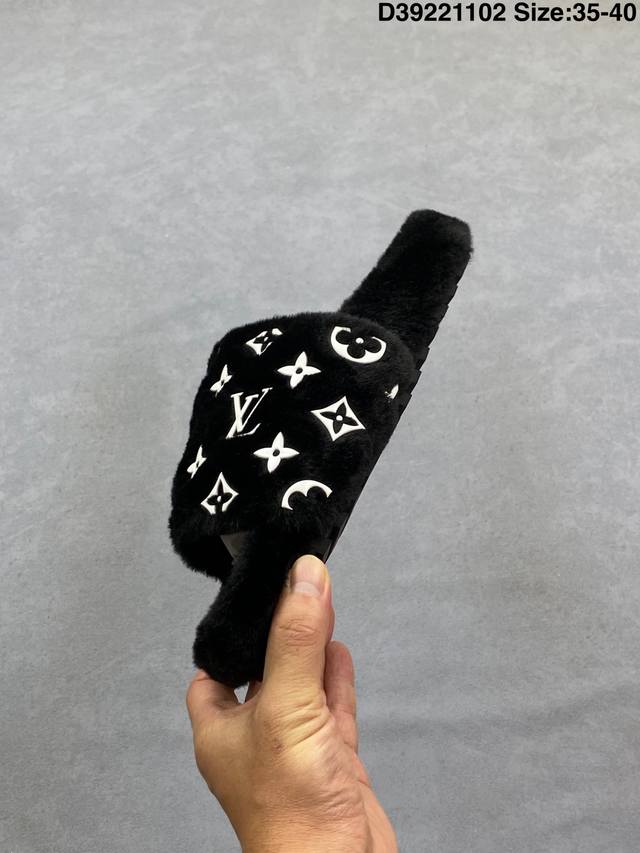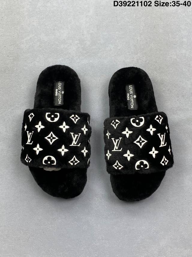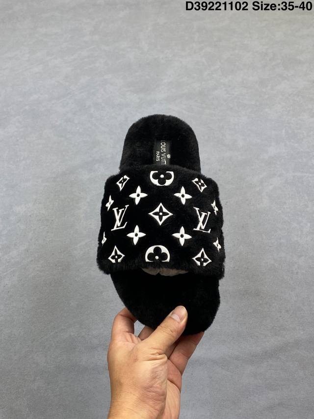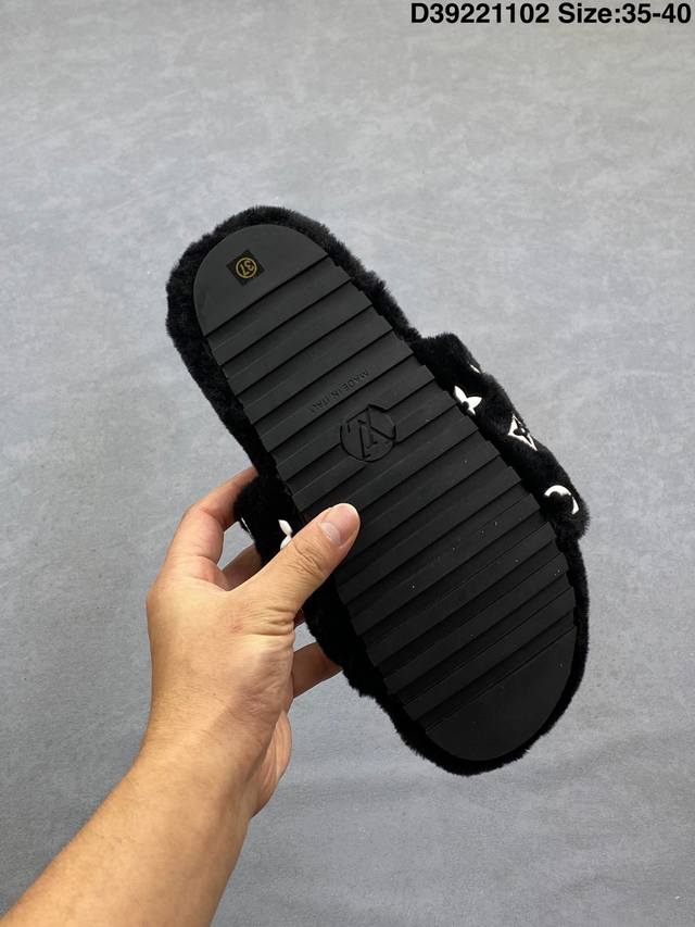Lv 路易威登 Louis Vuitton 毛茸茸系列毛绒女士复古平底露趾冬季拖鞋 羊绒Lv字母Logo 时尚女士棉拖鞋一字拖 DDD 人造羊毛革 拖鞋式凉鞋 Lv徽标 同色系鞋底 黑色外底 DDD 尺码:35-40 DDD 编码:D39221102 DDD