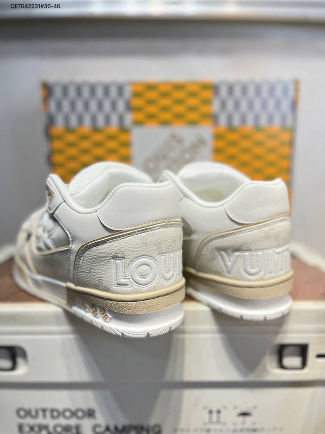 FFF Louis Vuitton Trainer Sneaker Low 路易威登 休闲运动文化百搭板鞋 DDD 舒适防滑底和百搭性霸屏整个时尚娱乐圈 细节调整完美主义 鞋面采用柔软皮革鞋面 独家开模大底 侧边采用3D打印标志性Logo 尽显贵族时尚气息 配带正品全套包装Qe7042231#36-46 DDD