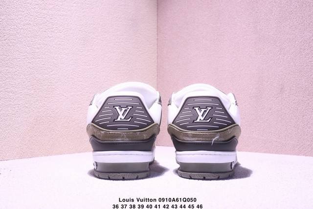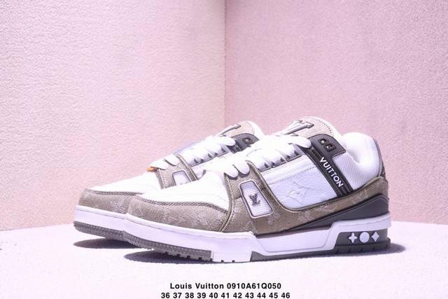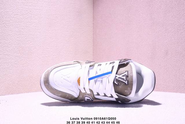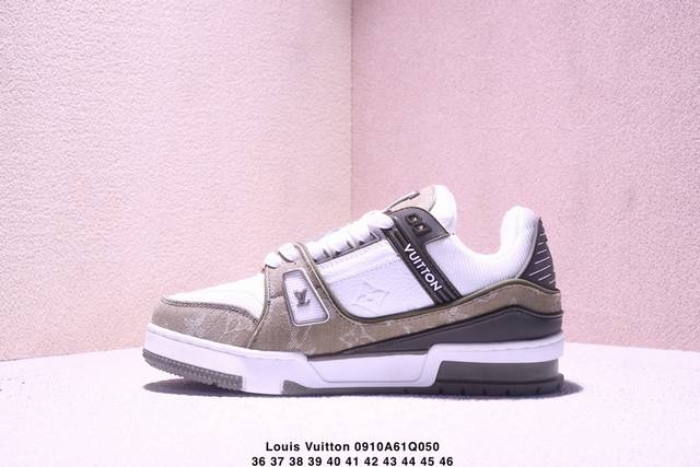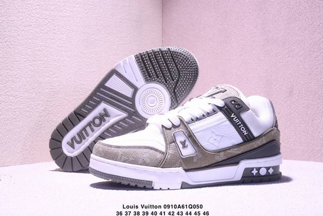 Louis Vuitton 路易威登 男女鞋,采用荔枝纹纤维革组合粒面牛剖革鞋面材质,鞋垫嵌入软脚感Eva物料,外置Tpr光泽隔色鞋底法国巴黎百年奢侈品牌Lv路易威登Louis Vuitton Trainer Sneaker Low 运动系列低帮复古百搭休闲运动文化篮球板鞋“