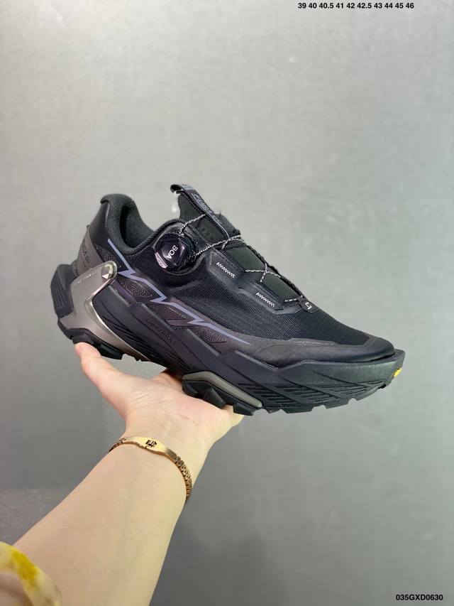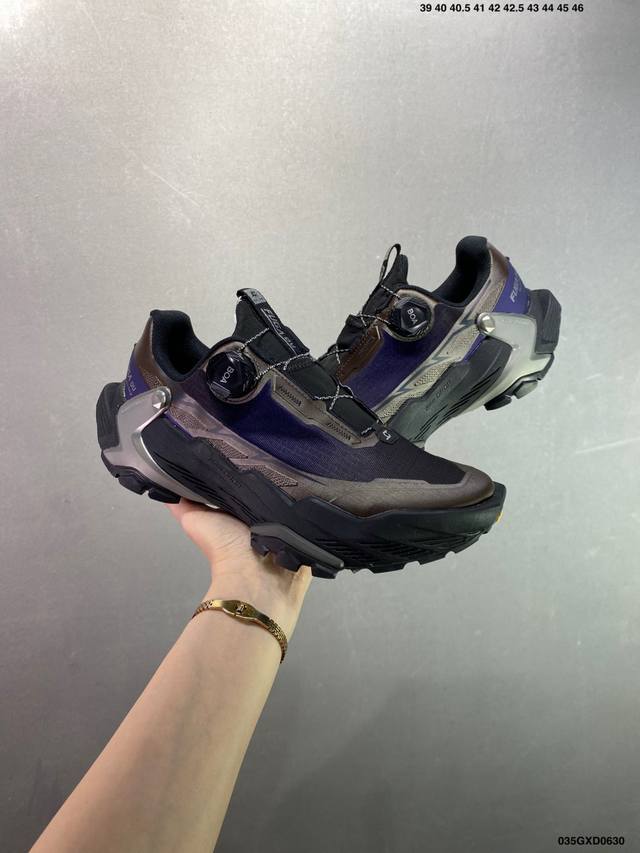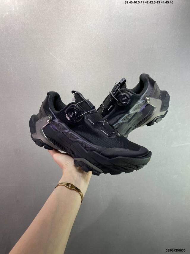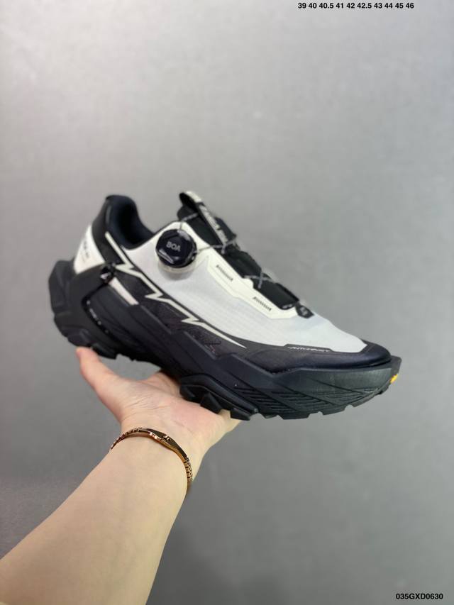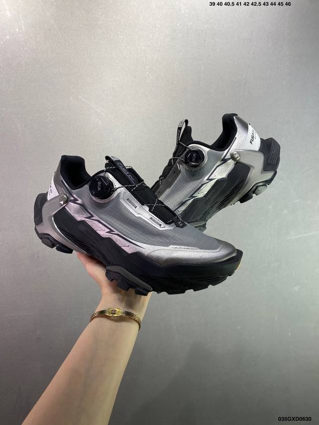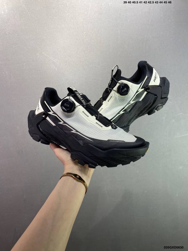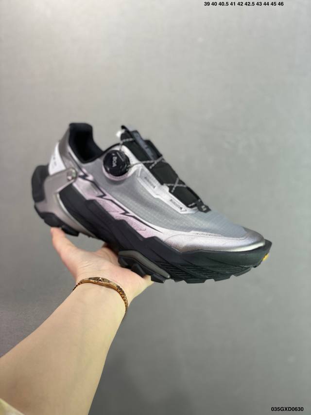 Boa适配系统 通过旋钮实现快速微调 精准贴合Vibram Megagrip Litebase 大底 125Mm超宽前掌 提供超强抓地力 可以轻松应对陡坡 湿滑路面等复杂的山野路况