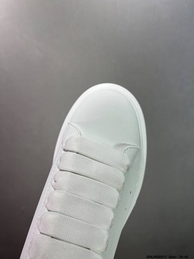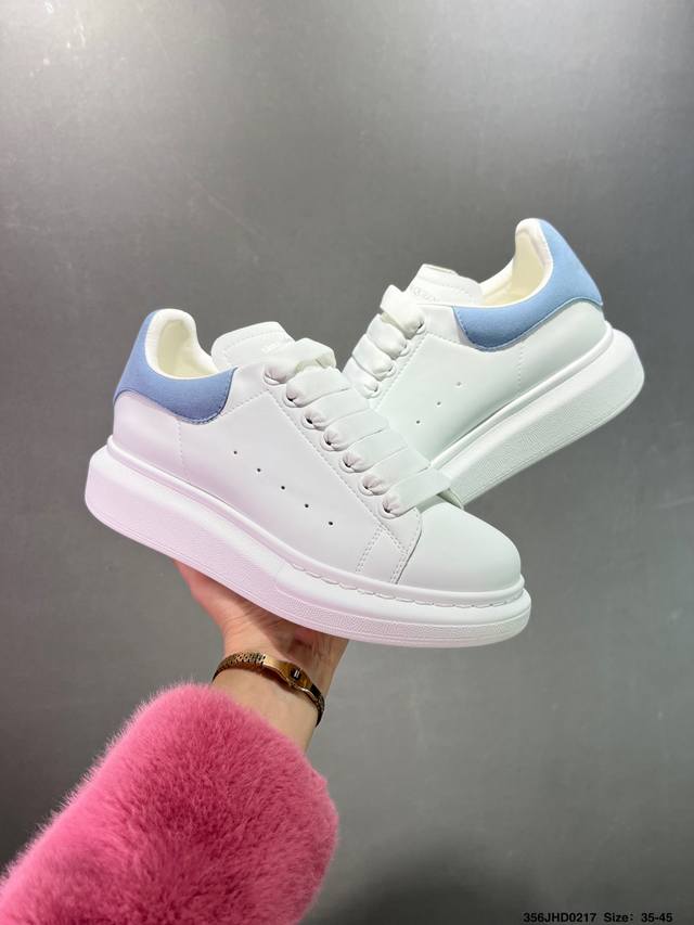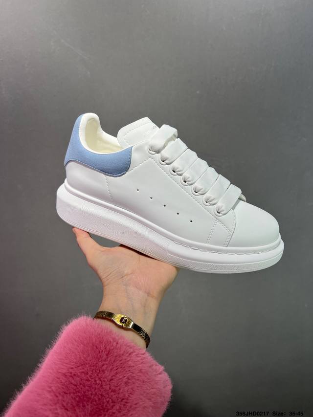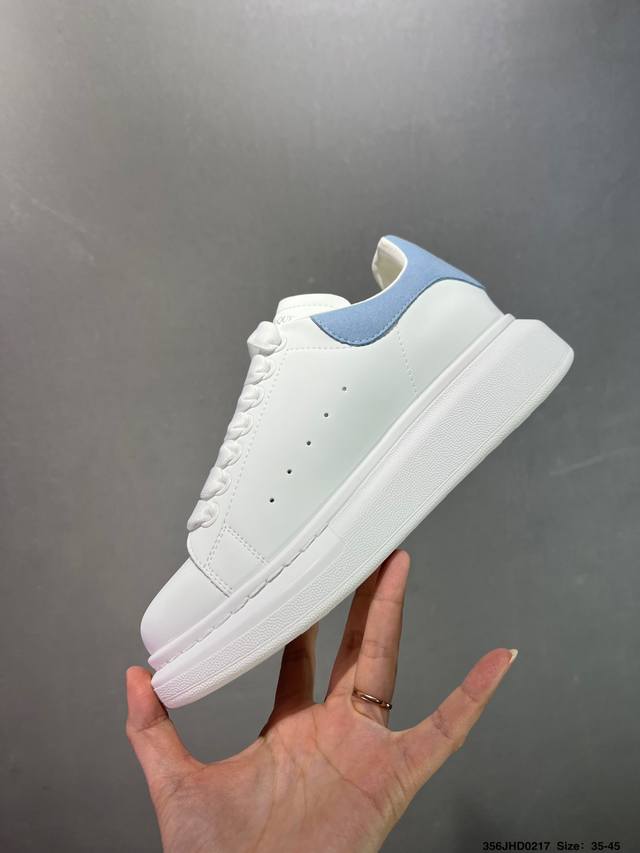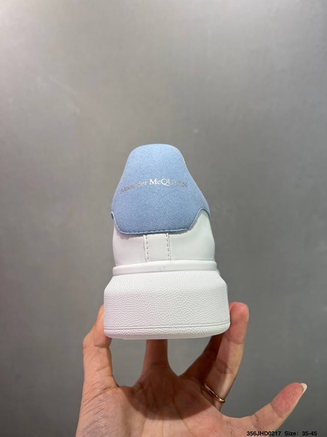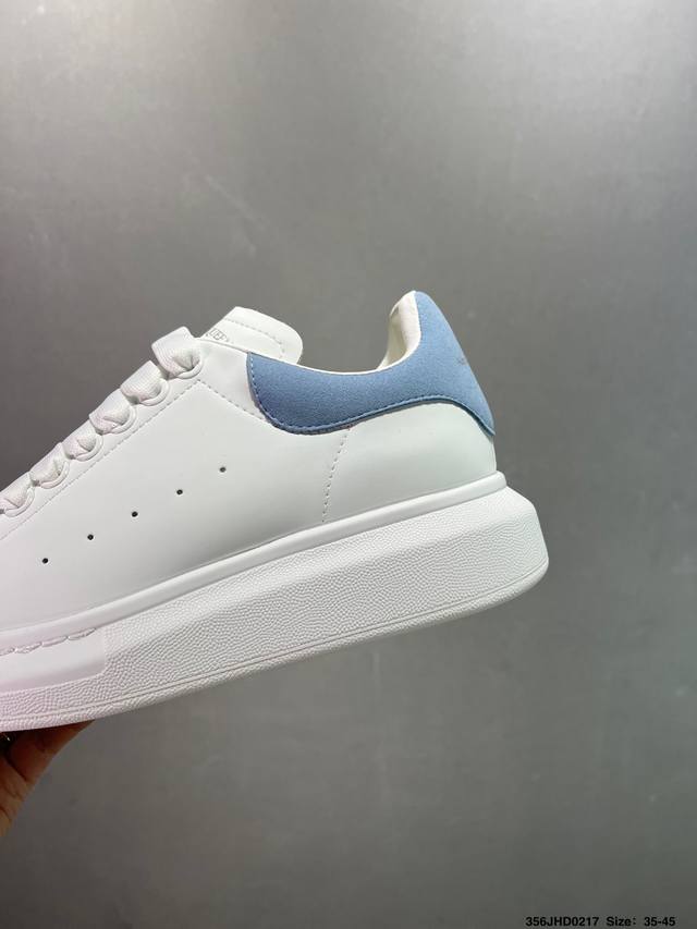 公司级意大利高奢品牌-亚历山大 麦昆Alexander Mcqueen Oversized Sneakers 低帮时装厚底休闲运动小白板鞋“皮革白钢笔蓝麂皮尾”深蓝麂皮尾色 采用丝绸硬质头层小牛皮鞋面材质 内外超软小羊皮贴脚透气及超软Pu脚感乳胶物料鞋 外置原抽真空高密度增高底 男女鞋广东原产品质 升级原楦原纸版数据开发 专柜包装物及配件 附送快递加固牛皮纸盒